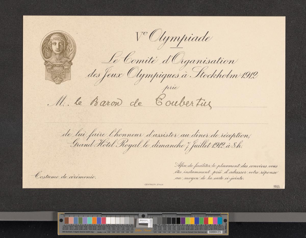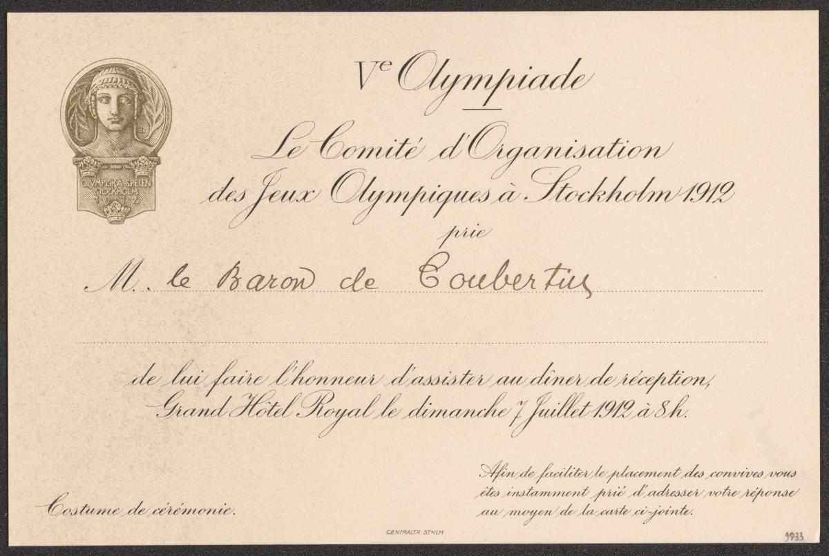Emblème des Jeux et légende "Ve Olympiade. Le Comité d'Organisation des Jeux Olympiques à Stockholm 1912 prie M. le Baron de Coubertin de lui faire l'honneur d'assister au dîner de réception Grand Hôtel Royal le dimanche 7 juillet 1912 à 8h."