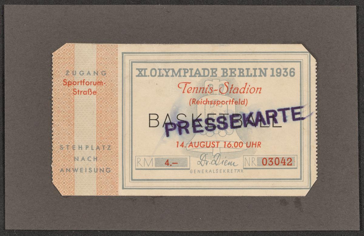 Carte de presse avec l'emblème des Jeux en arrière-fond, texte: "XI. OLYMPIADE BERLIN 1936 / Tennis-Stadion / (Reichsportfeld) / BASKETBALL / 14. AUGUST 16.00 UHR". Carte traversée par le texte d'un tampon: "PRESSEKARTE".