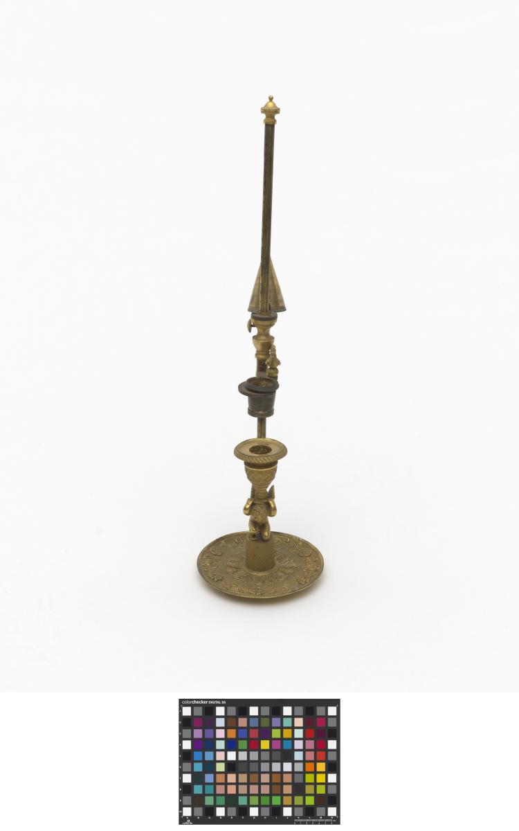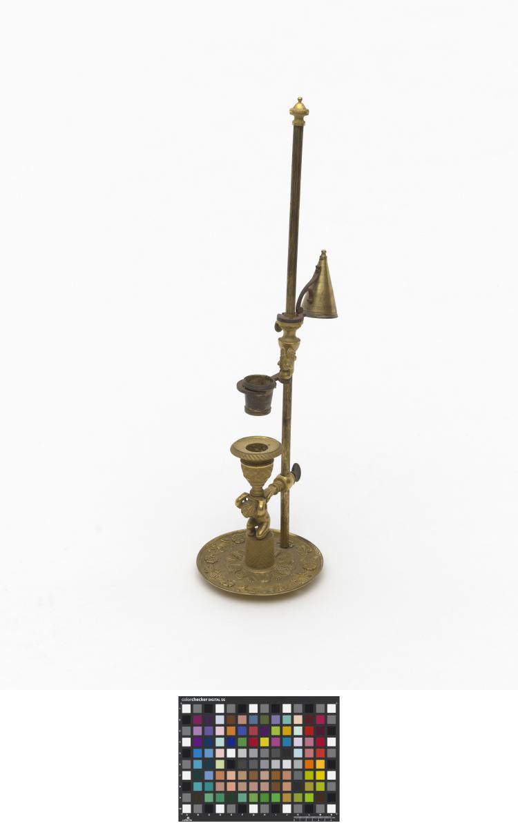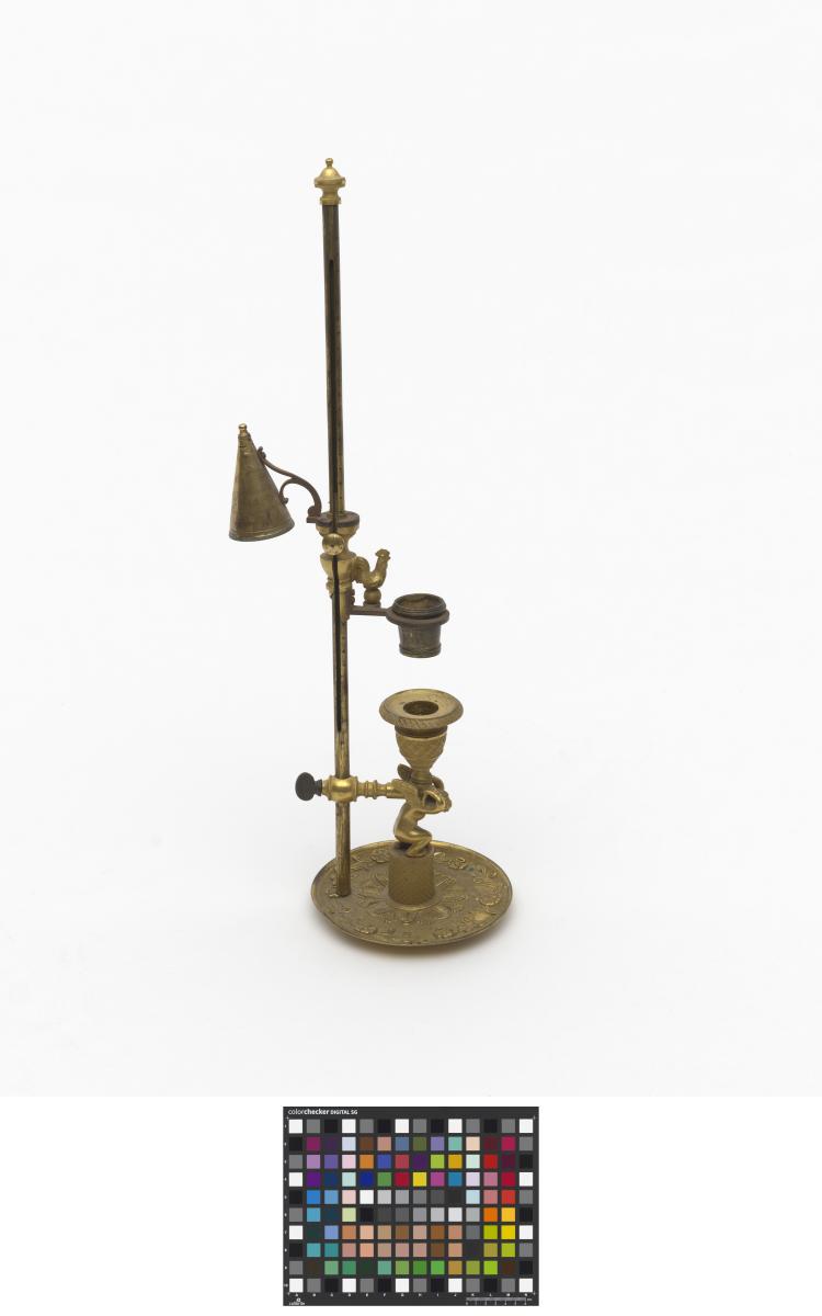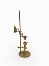 Bougeoir à une bougie avec système d'éteignoir (capuchon permettant d'éteindre la bougie) orné d'un angelot et d'un coq. En laiton doré, gravé sur le capuchon "Bonne nuit".