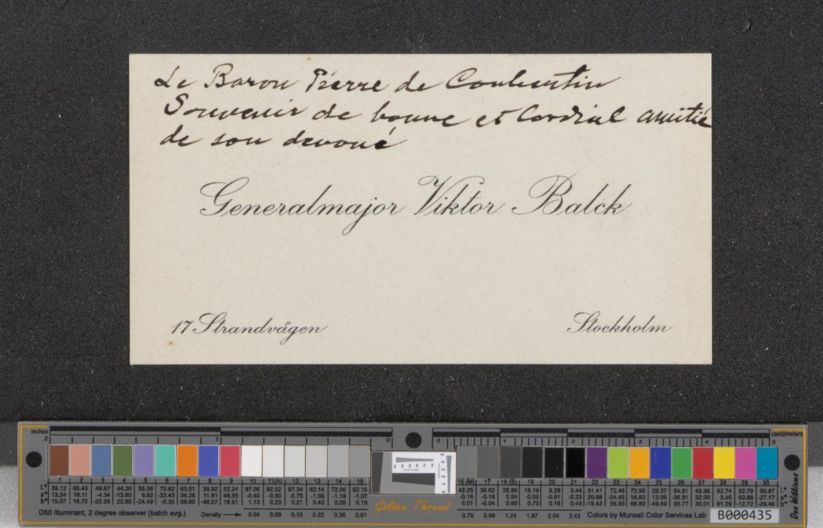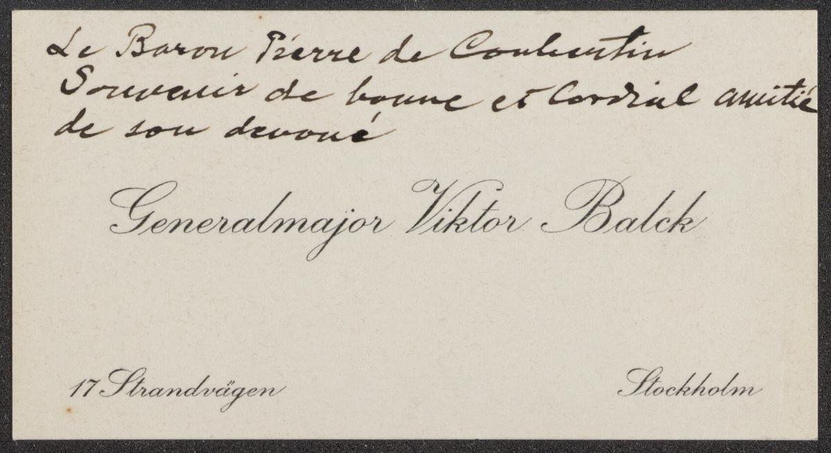 Carte de visite avec la légende: "Generalmajor Viktor Balck / 17 Strandwägen Stockholm". Inscription manuscrite: "Le Baron Pierre de Coubertin / Souvenir de bonne et cordial amitié / de son dévoué".