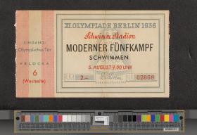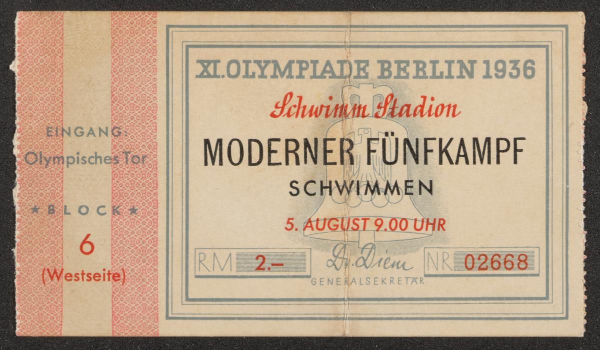 Billet d'entrée avec l'emblème des Jeux en arrière-fond, texte: "XI. OLYMPIADE BERLIN 1936 / Schwimm Stadion / MODERNER FÜNFKAMPF / SCHWIMMEN / 5. AUGUST 9.00 UHR". Coupon détaché.