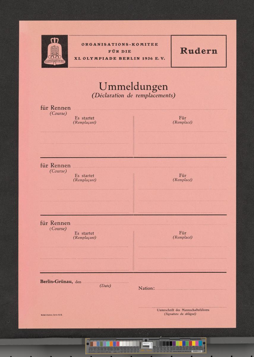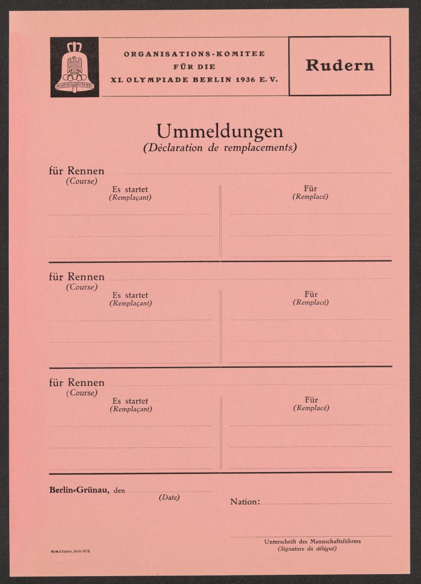 Formulaire avec l'emblème des Jeux. Texte bilingue: "Rudern, Organisations-Komitee für die XI. Olympiade Berlin 1936 E.V., Déclaration de remplacements, (course), (remplaçant), (remplacé)...".