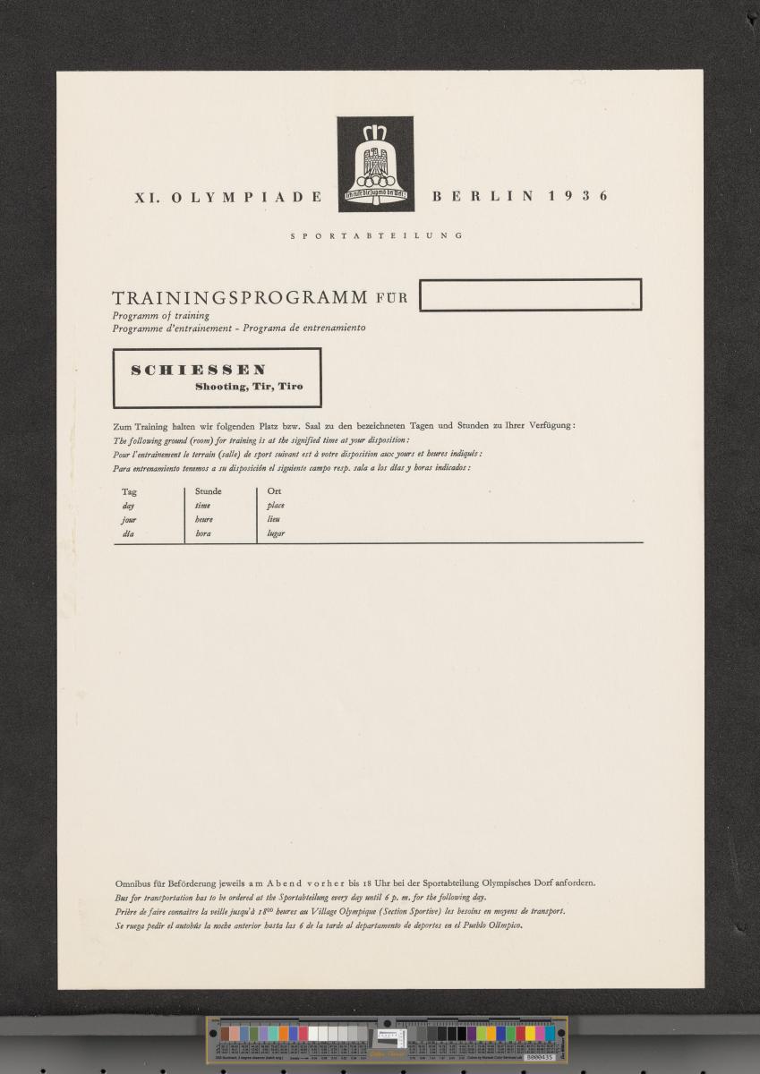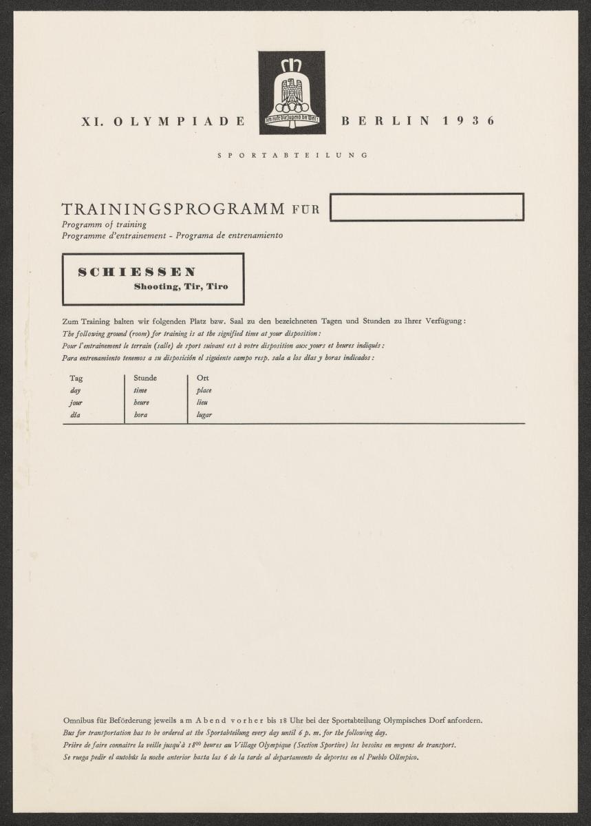 Légende en quatre langues: "XI. Olympiade Berlin 1936. Sportabteilung. Programme d'entraînement. Tir. Pour l'entraînement le terrain (salle) de sport suivant est à votre disposition aux jours et heures indiqués".