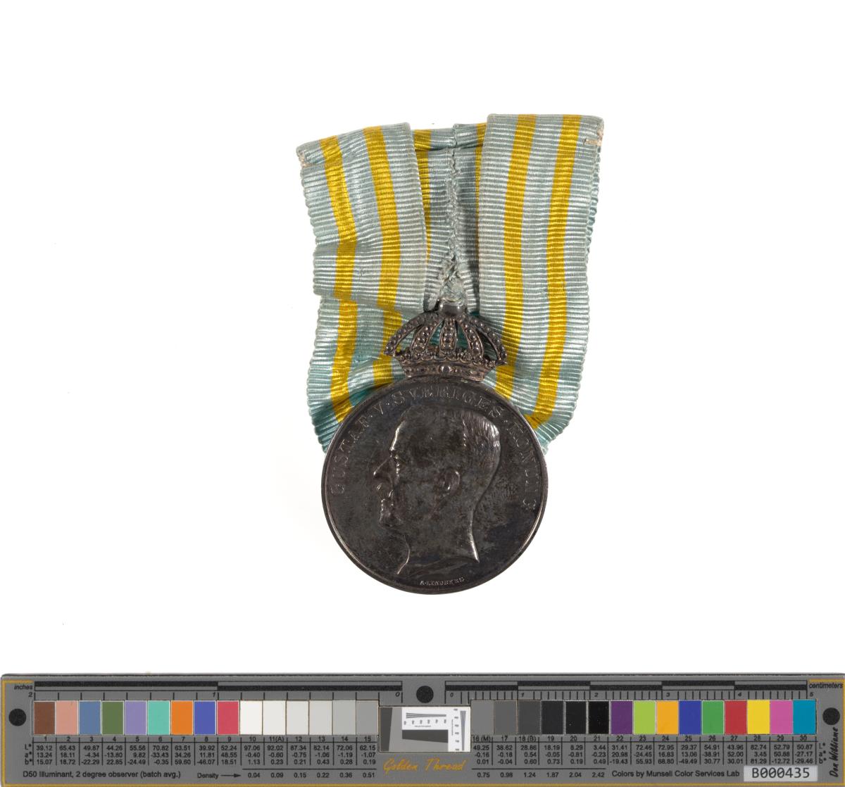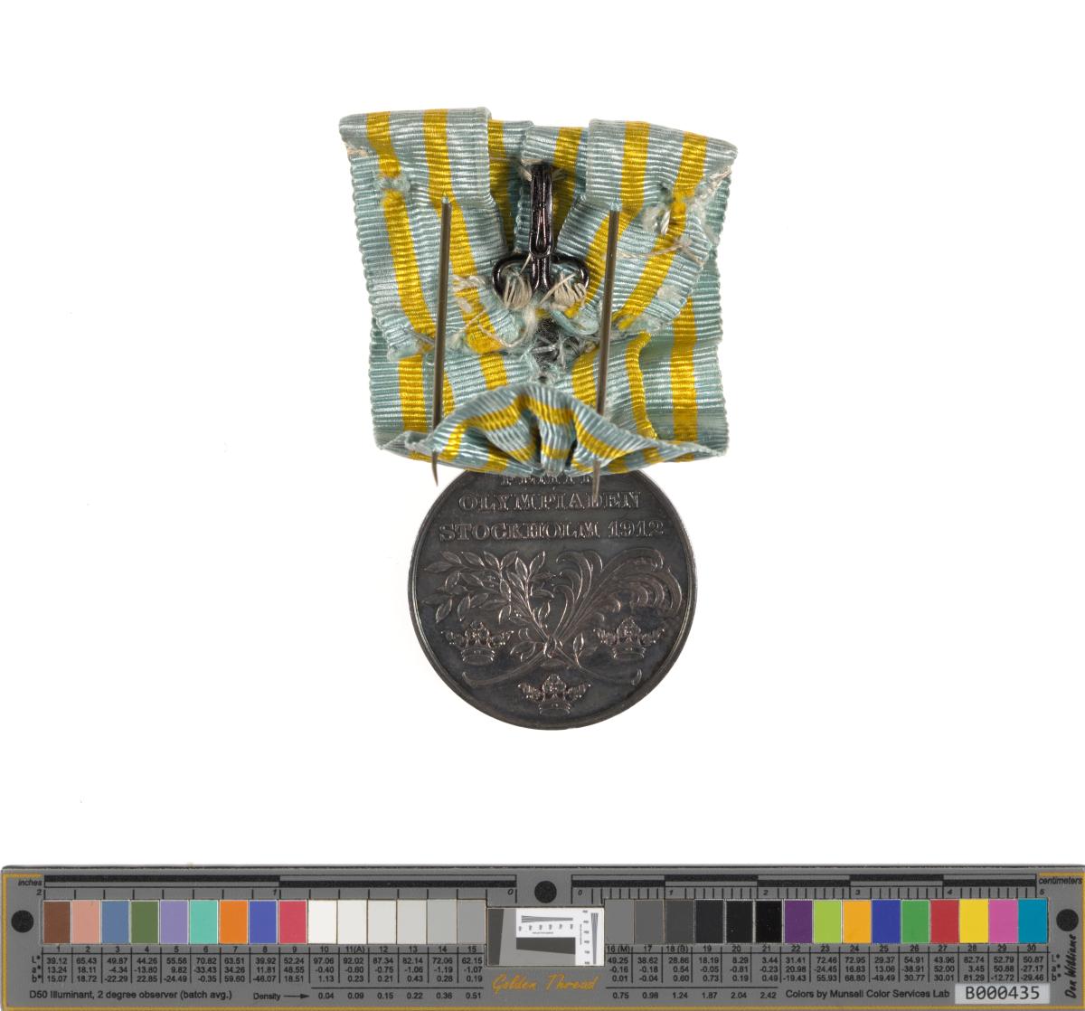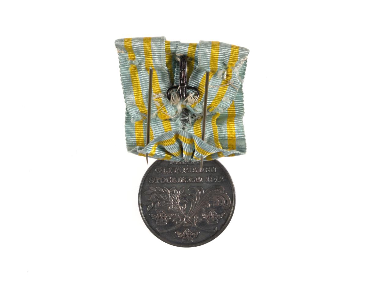 Avers : tête du roi Gustave V, roi de Suède, légende : "Gustaf V Sveriges Konung". Revers : couronnes et rameaux, légende : "Femte Olympiaden Stockholm 1912". Ruban aux couleurs du drapeau suédois.
