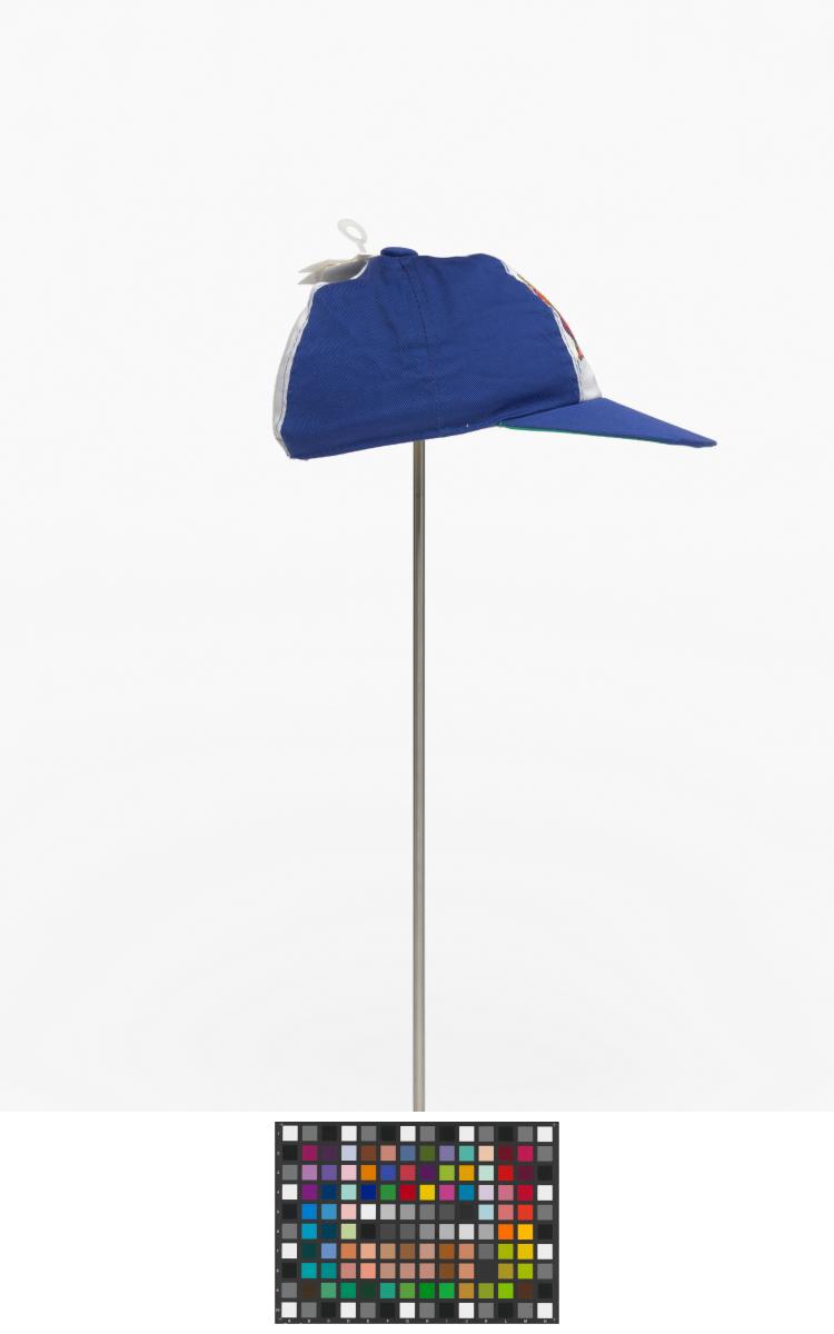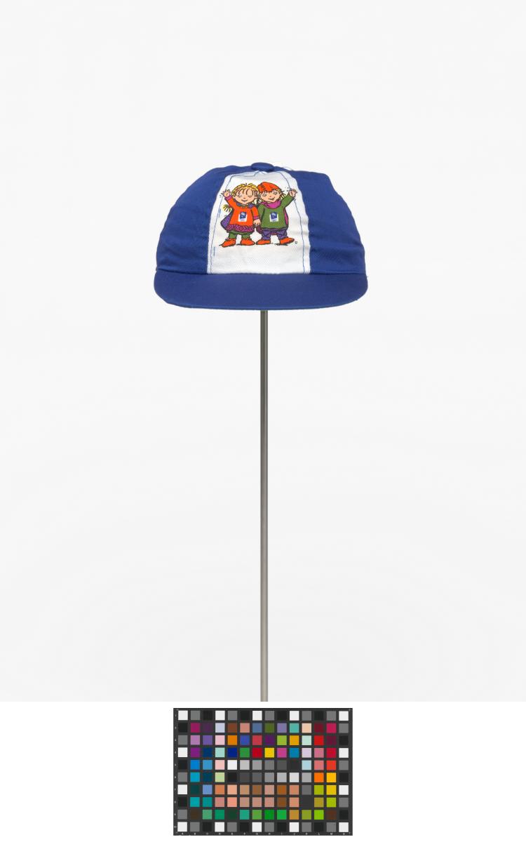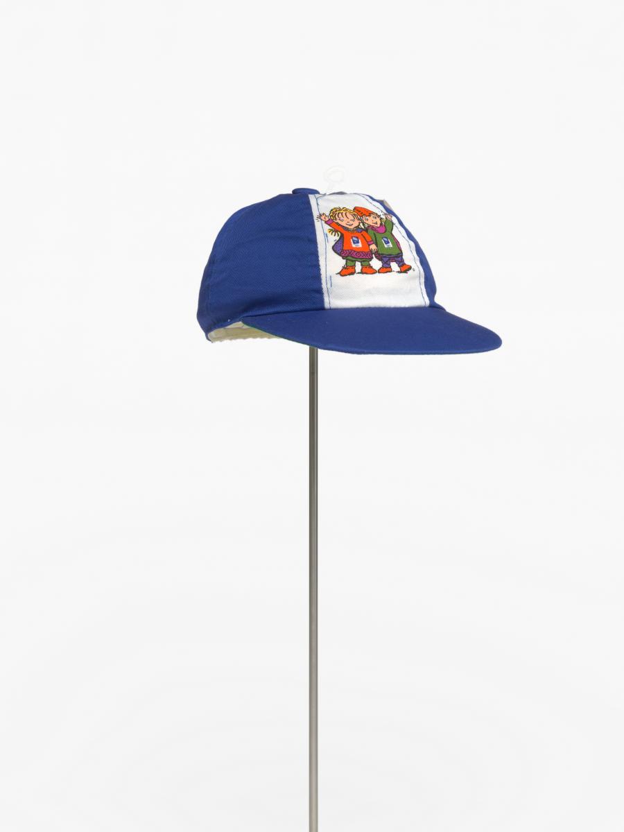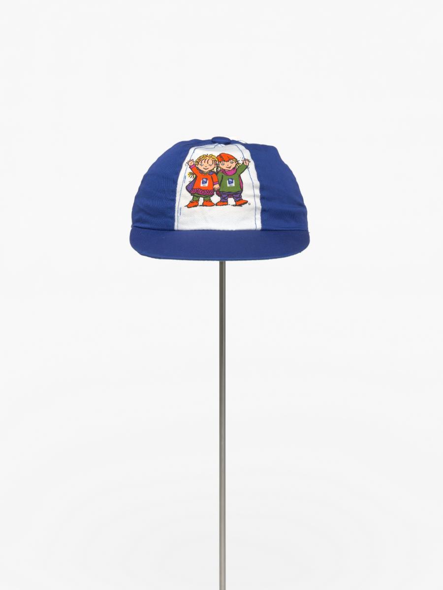 Casquette pour enfant bleue et blanche avec Hakon et Kristin, les mascottes des Jeux à l'avant et l'emblème des Jeux à l'arrière. Taille unique.