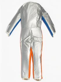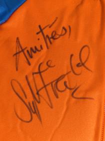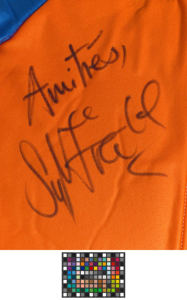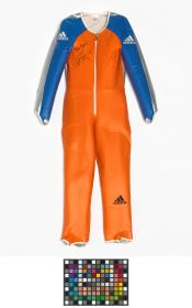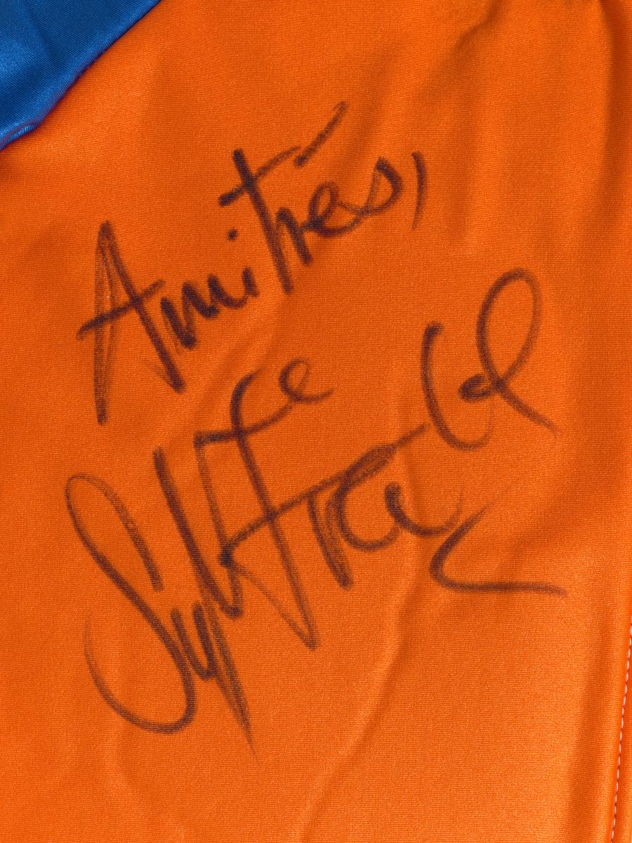 Combinaison orange et bleu avec dédicace de l'athlète: "Amitiés", et signature de l'athlète" .