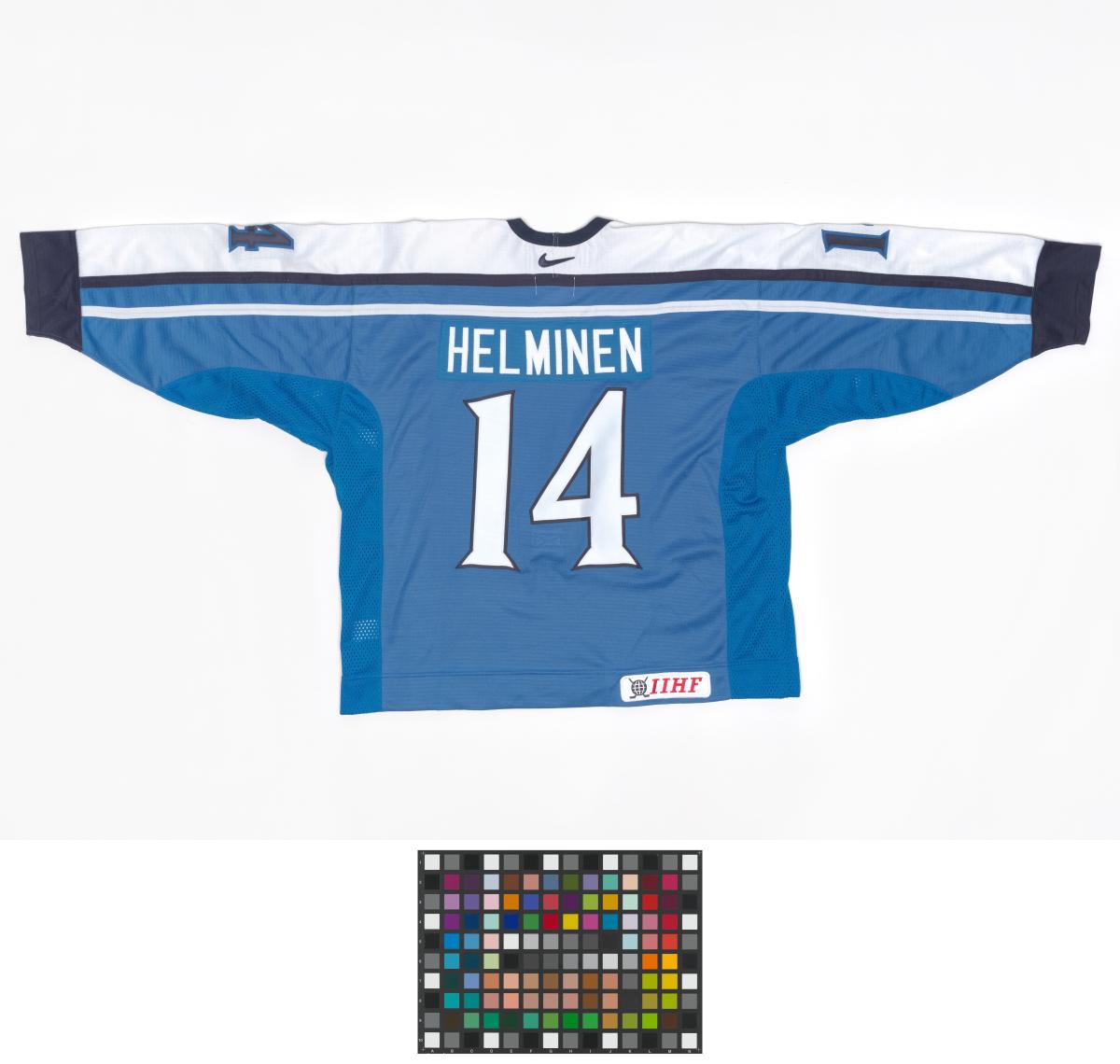 Maillot bleu et blanc de marque Nike. Légende à l'avant: "Suomi" avec les armoiries finlandaises. Légende dos: "Helminen / 14". Manches: "14". Taille 58.