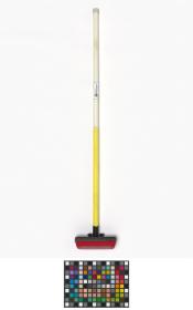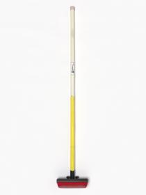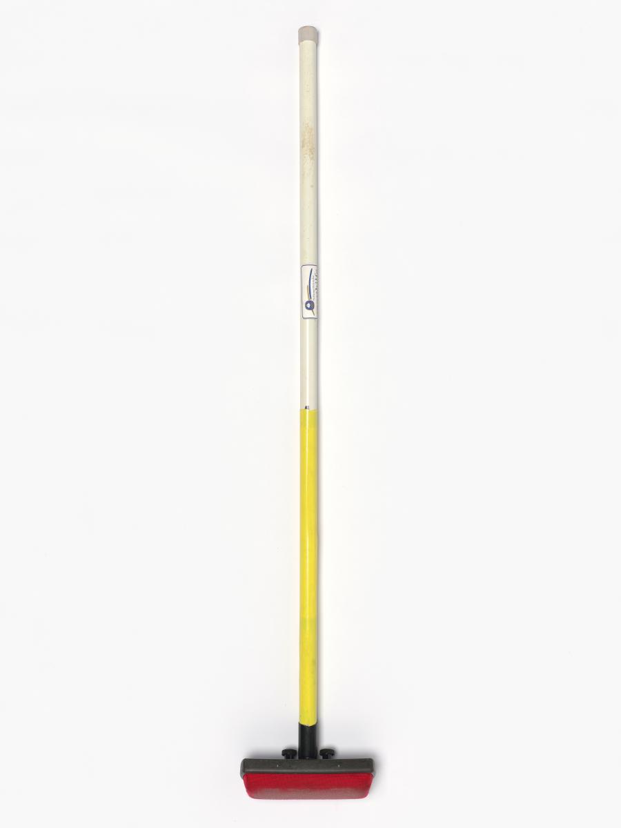 Balai à manche jaune de marque Asham. Modèle "The Transformer". Signature de l'athlète.
