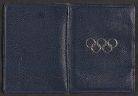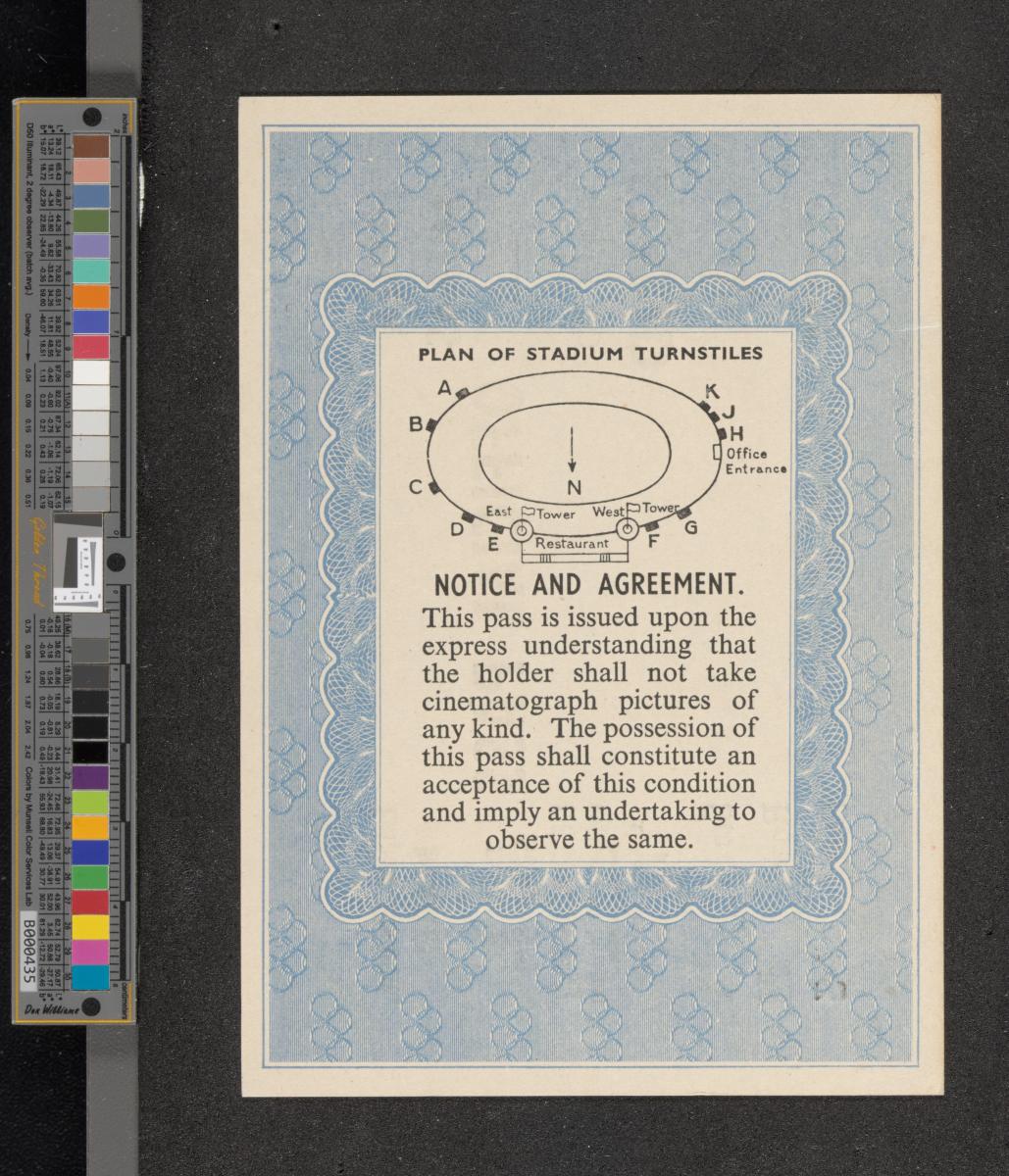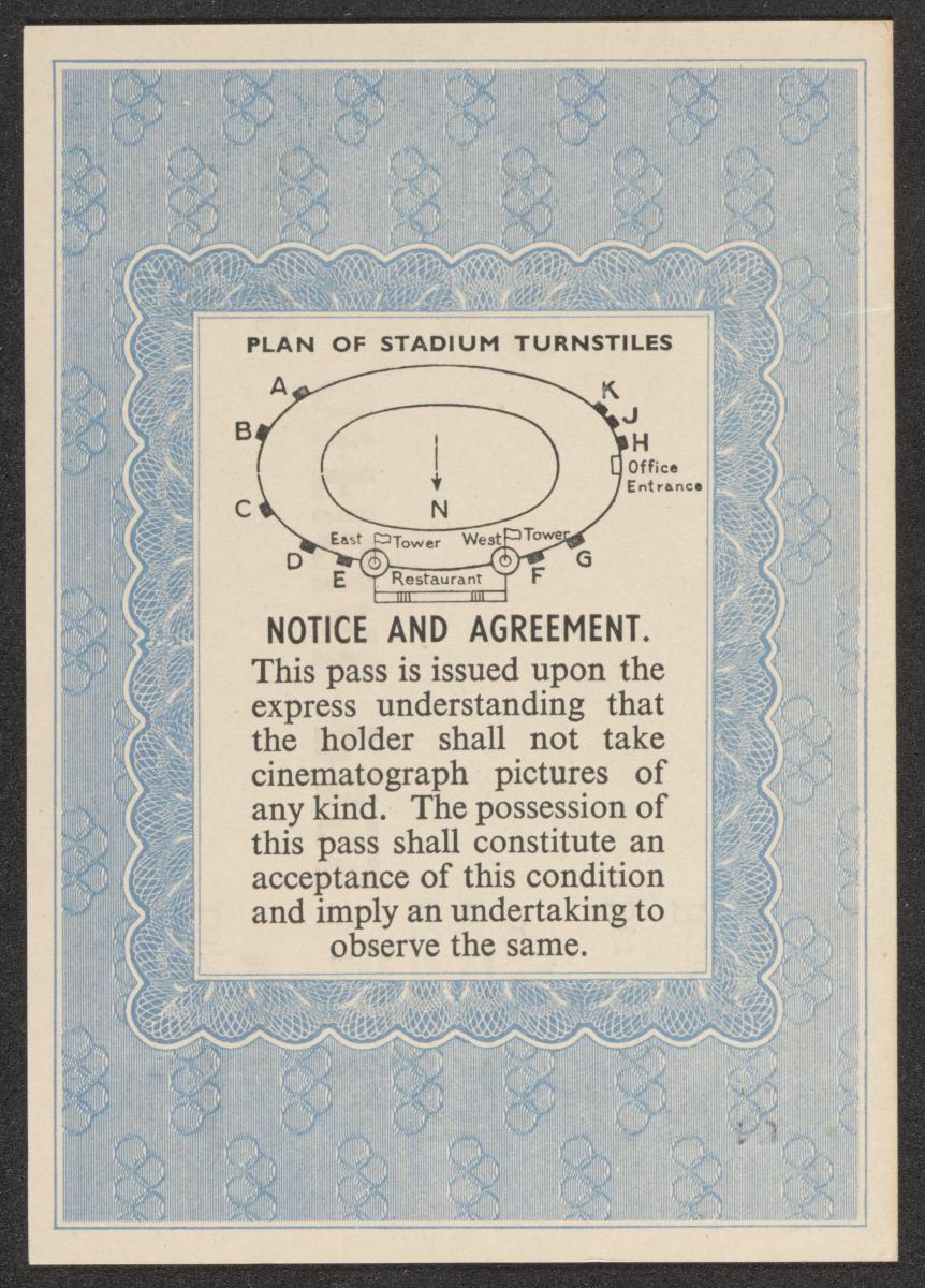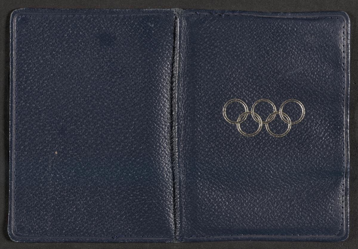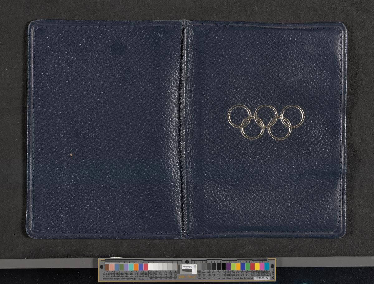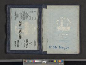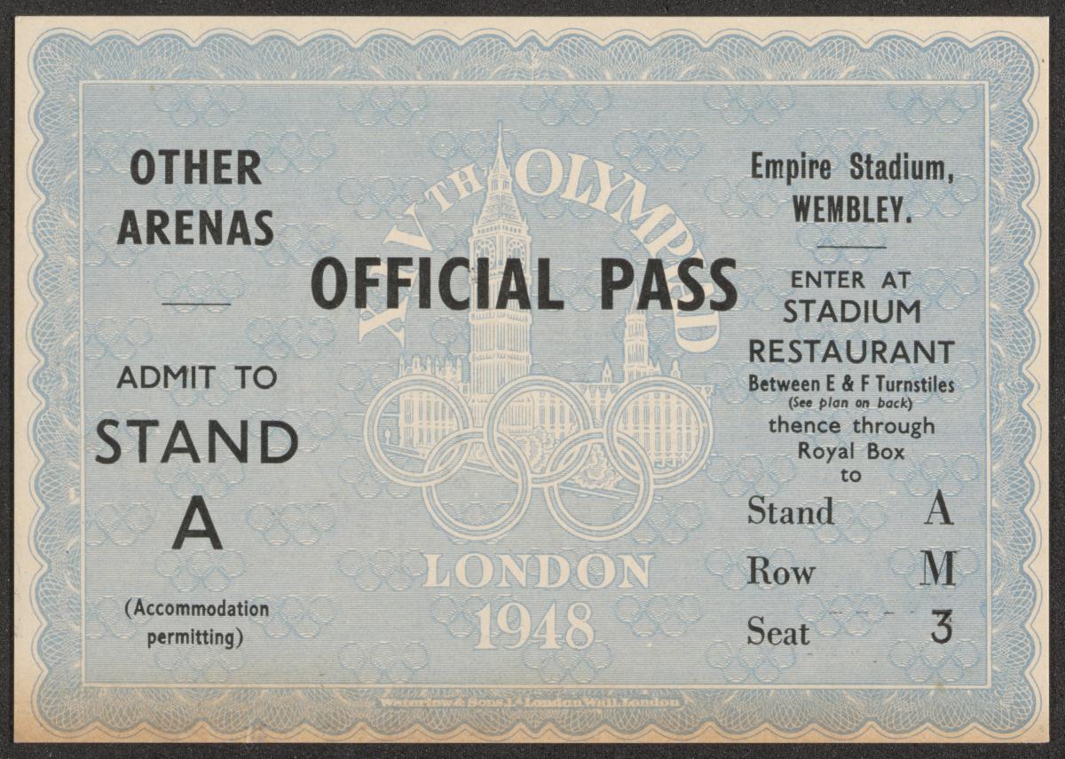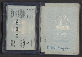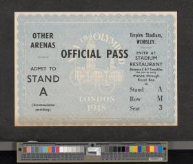 Feuillet conservé dans un étui en cuir orné de l'emblème officiel des Jeux. Texte : "Official pass, Empire Stadium, Wembley. Enter at Stadium restaurant, Between E & F turnstiles thence through Royal Box to stand M, Row V, Seat 3. Other arenas, Admit to Stand A (Accomodation permitting)". Conditions d'admission au dos.