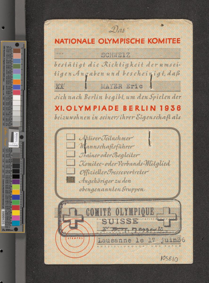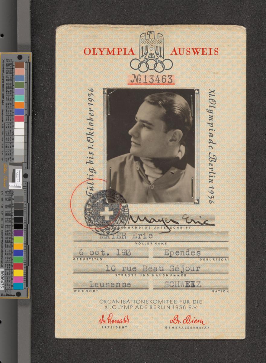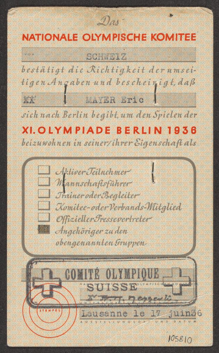 Berlin 1936, carte d'identité délivrée à Eric MAYER (SUI), membre de délégation.