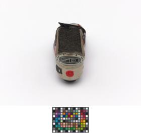 Chaussure moulée avec bandes velcro. Légende (sur la semelle) "Step into the future". Signée sur la pointe.