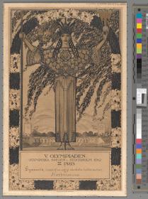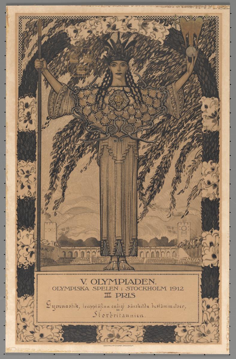 Légende: "V. OLYMPIADEN. OLYMPISKA SPELEN i STOCKHOLM 1912 III PRIS i Gymnastik, trupptäfian enligt särskilda bestämmelser, Storbritannien". Déesse Pallas-Athéna avec le stade olympique en arrière fond. La déesse tient dans la main droite un bâton et dans l'autre une statuette de Nike, la déesse de la victoire. Derrière elle, une cadre orné de fleurs et un arbre, probablement un bouleau. Signé et daté.