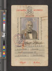 Texte en allemand "Olympia Ausweis". Photo, signature et adresse.