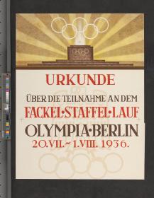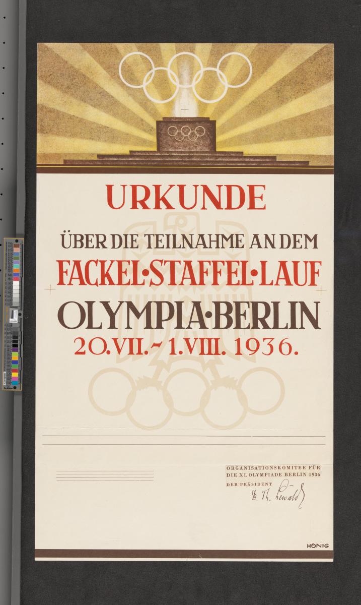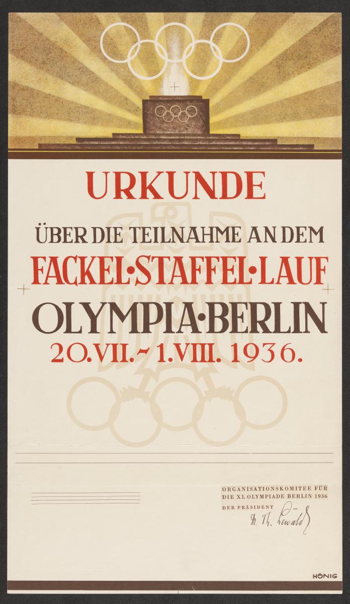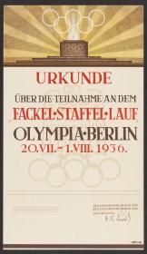 Illustration de l'autel de la flamme olympique surmonté par les anneaux olympiques sur fond de rayons de soleil. Légende: "Urkunde über die Teilnahme an dem Fackel-Staffel-Lauf Olympia-Berlin 20.VII-1.VIII 1936". En arrière-fond l'emblème des Jeux. Le document porte en bas la signature de Theodor Lewald, au nom du Comité d'organisation.