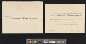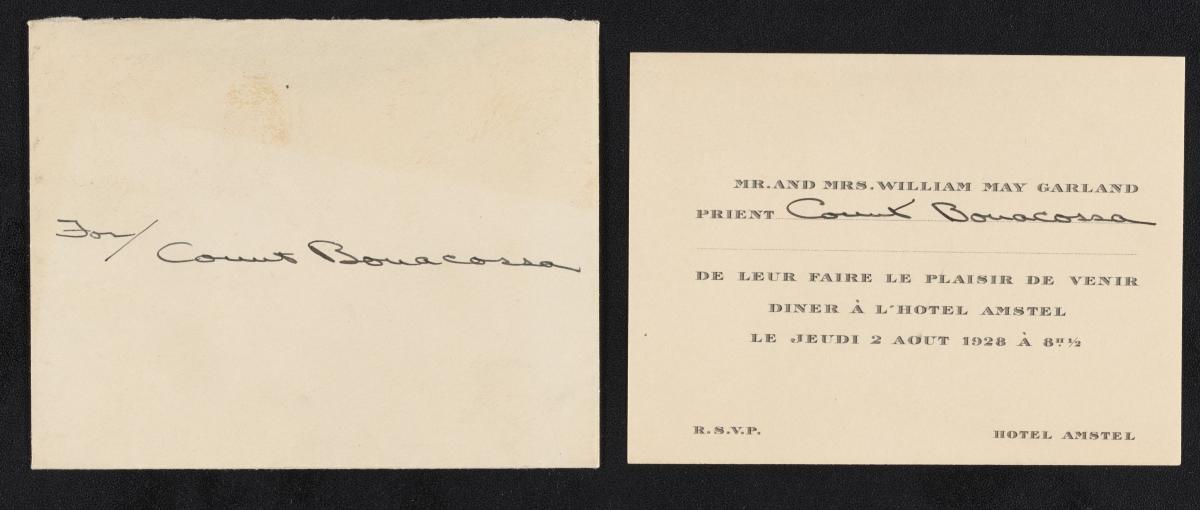 Légende: "MR AND MRS WILLLIAM MAY GARLAND / PRIENT COUNT BONACOSSA / DE LEUR FAIRE LE PLAISIR DE VENIR / DINER Á L’HOTEL AMSTEL / LE JEUDI 2 AOUT 1928 Á 8H 1/2".