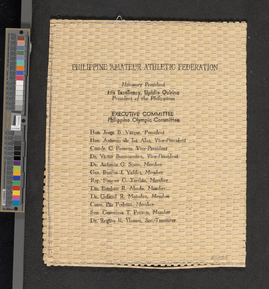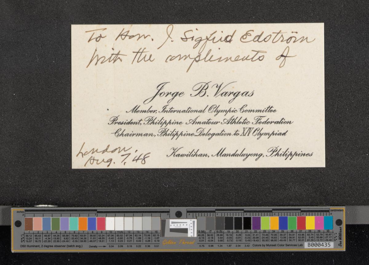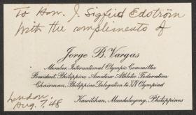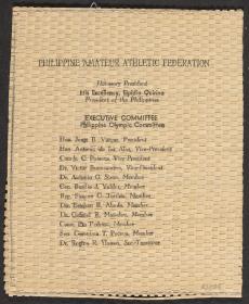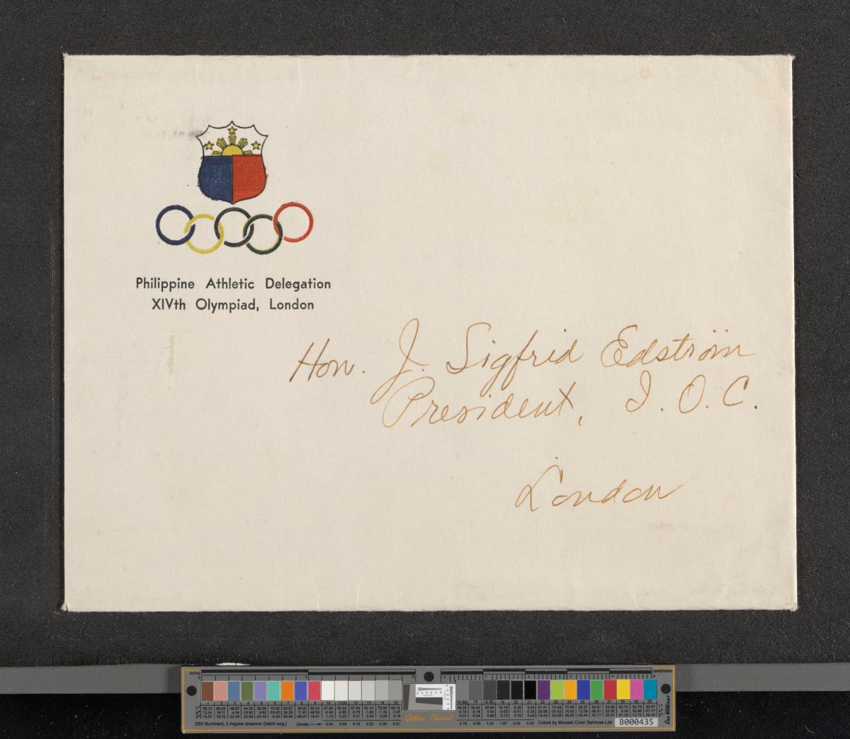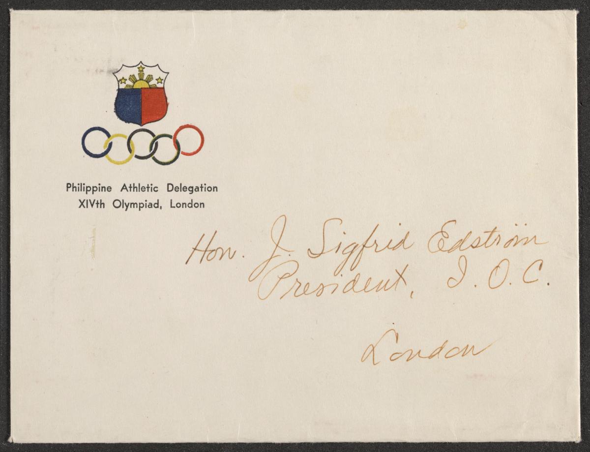 Londres 1948, carte de présentation de la délégation des Philippines adressée au Président Sigfrid Edström.