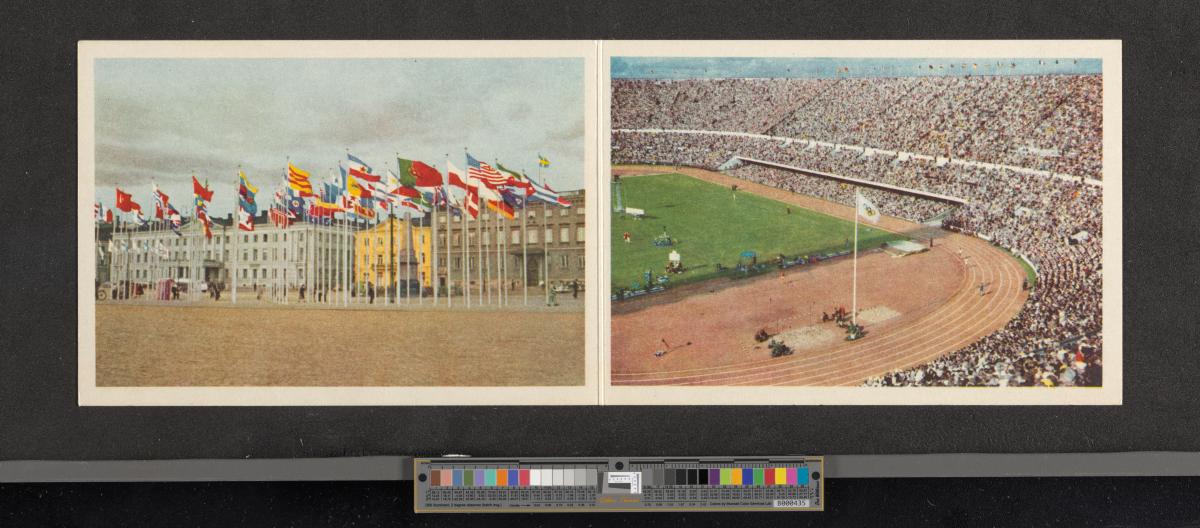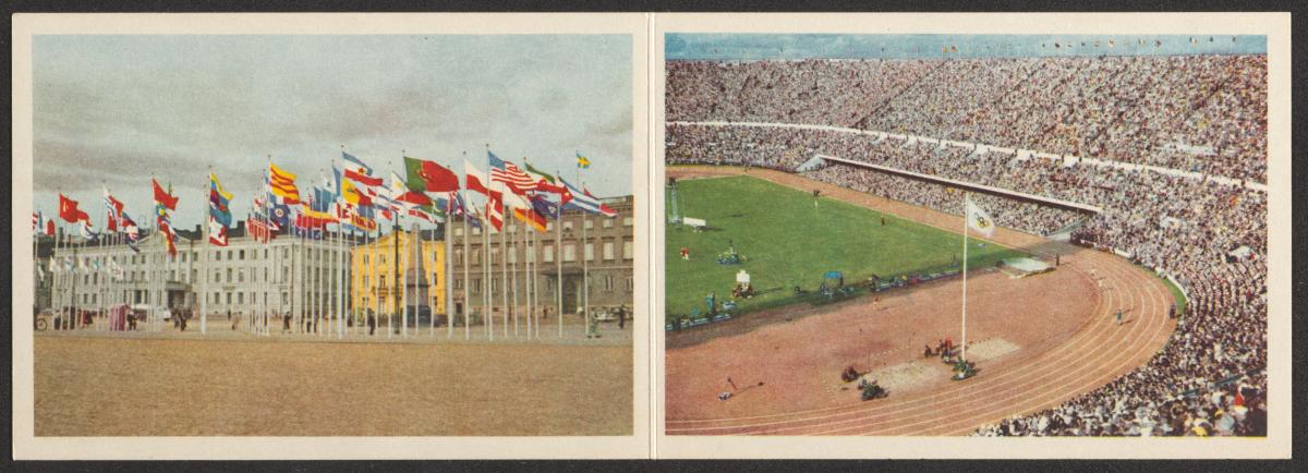 Carte de voeux avec à gauche une place de la ville avec les drapeaux nationaux des pays participants aux Jeux. A droite le stade olympique d'Helsinki avec le drapeau olympique. Texte bilingue sur la couverture: "Merci pour la XVe Olympiade / et mes voeux cordiaux pour 1953.".