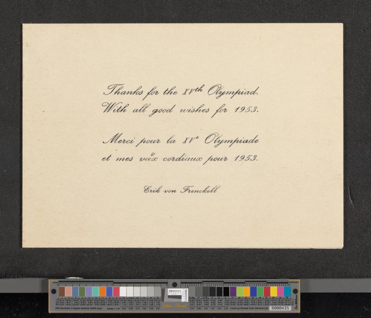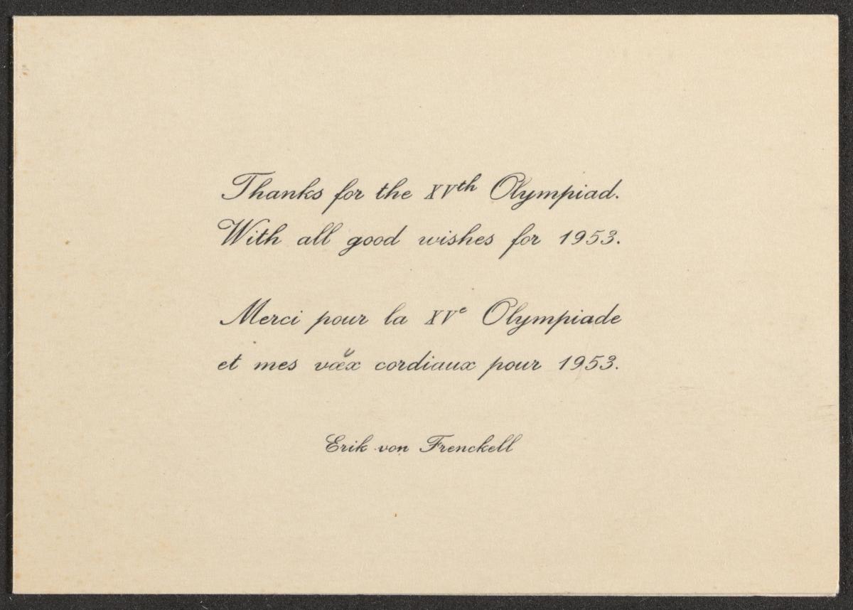 Helsinki 1952, carte de voeux envoyée par Erik VON FRENCKELL (FIN), président du Comité d'organisation.