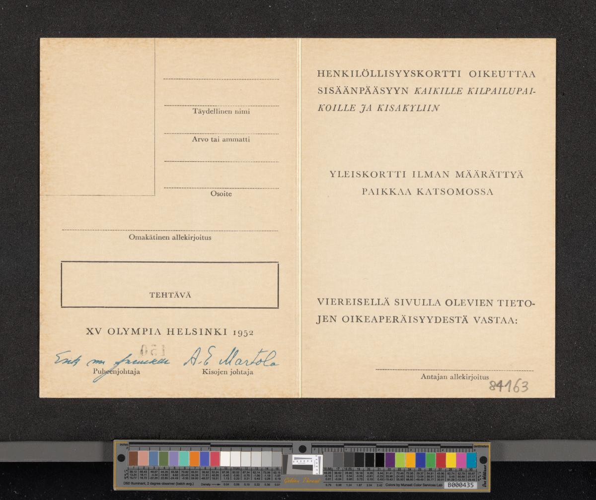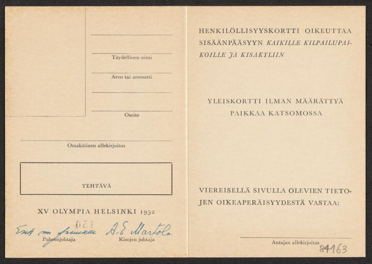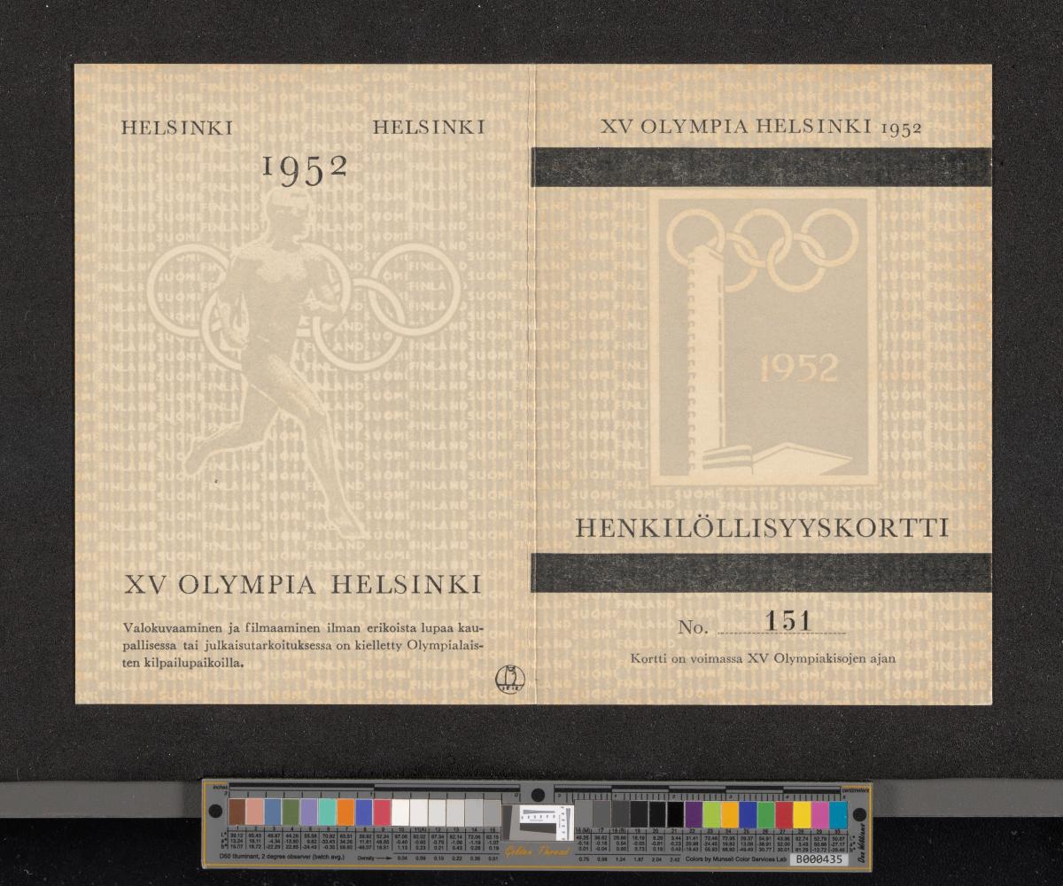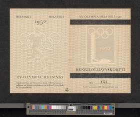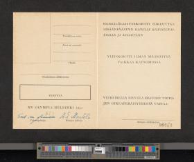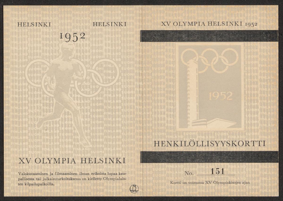 Helsinki 1952, carte d'identité grise pour les inspecteurs des sites olympiques.