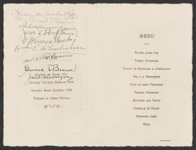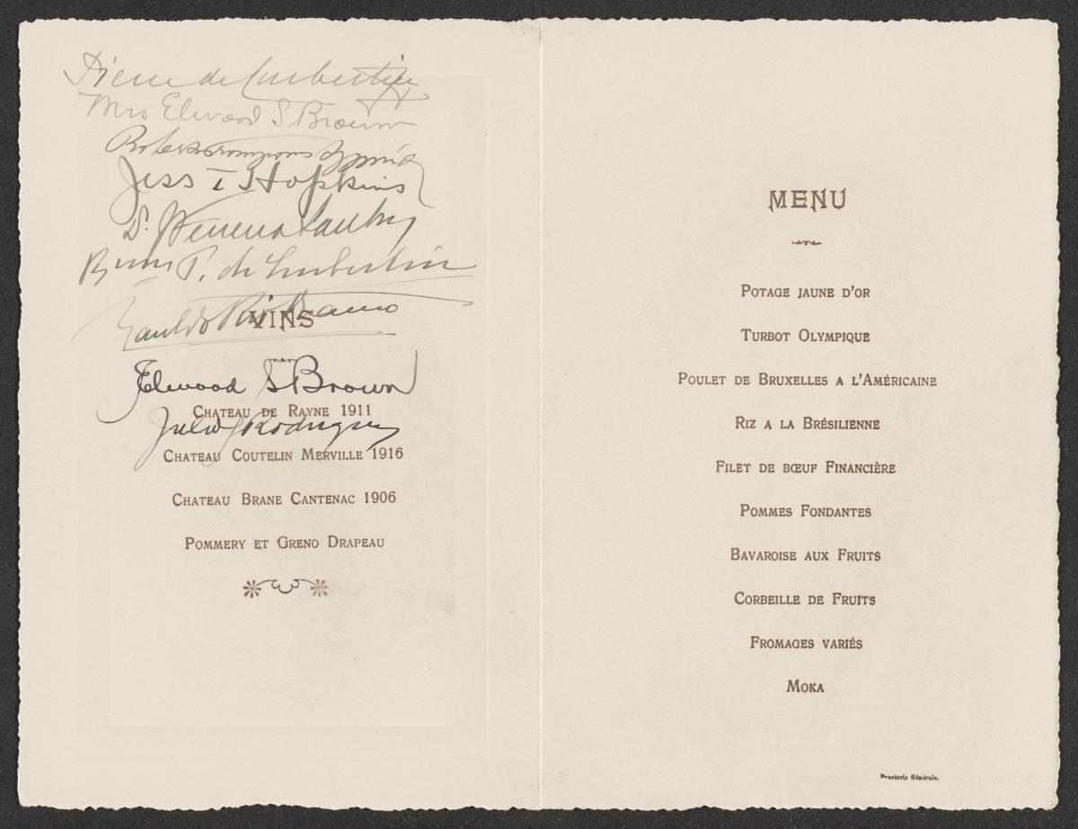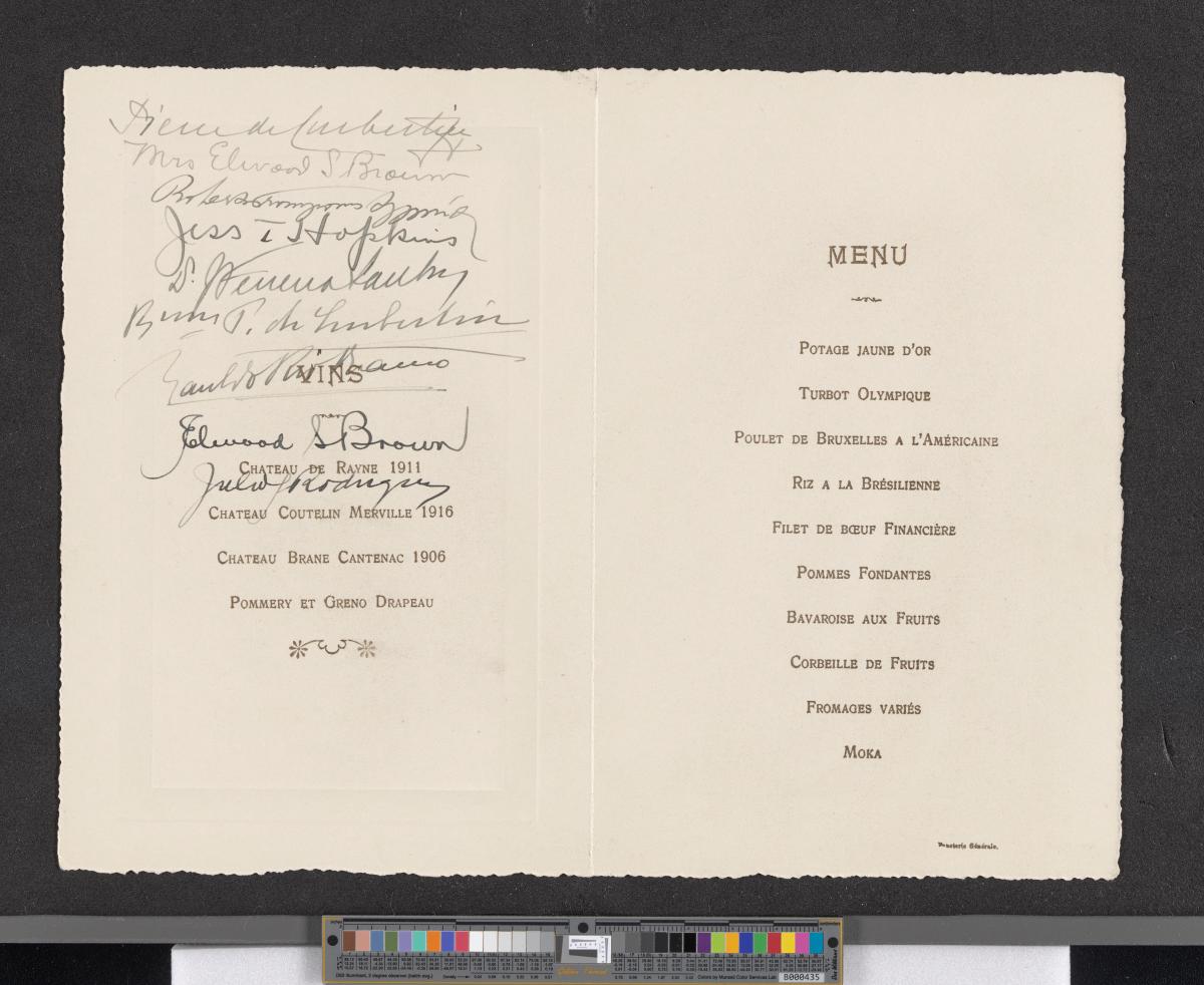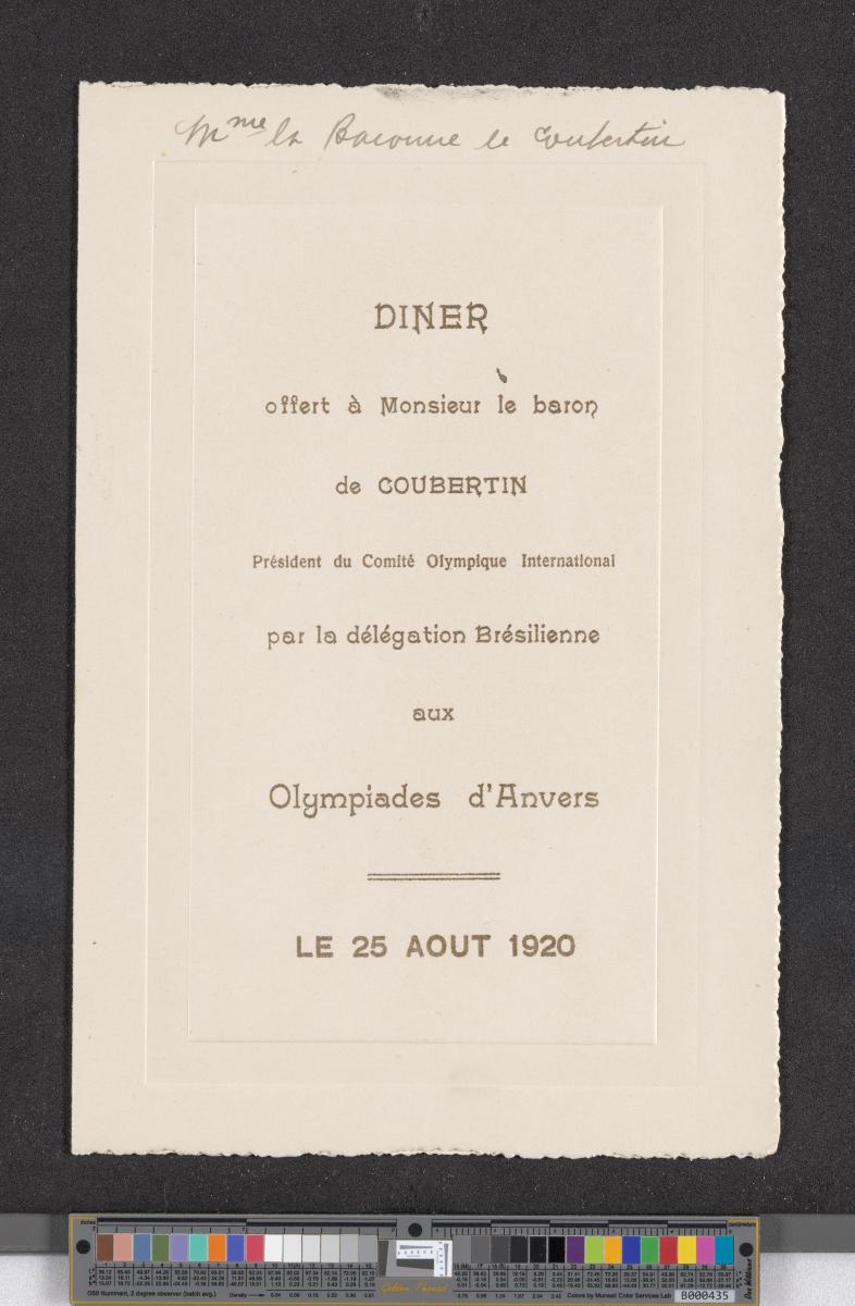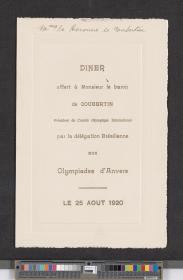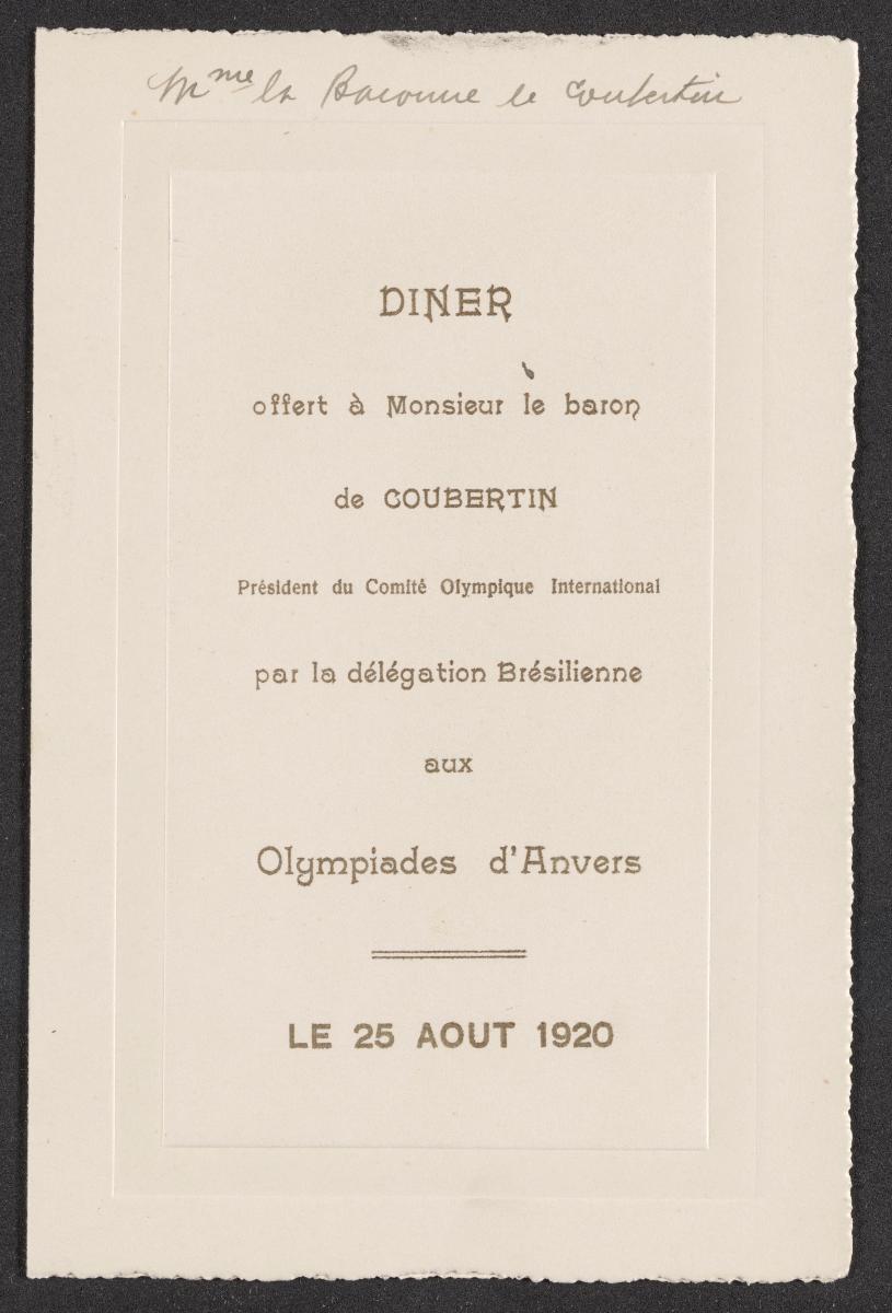 Carte d'invitation avec le texte sur la couverture: "DINER / offert à Monsieur le baron / de COUBERTIN / Président du Comité Olympique International / par la délégation Brésilienne / aux / Olympiades d’Anvers / LE 25 AOUT 1920". Inscription manuscripte : "Mme la Baronne de Coubertin". Diverses signatures dont celle de Pierre de Coubertin à l'intérieur avec le menu du diner.