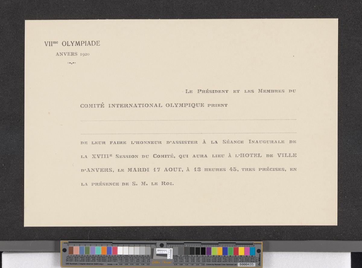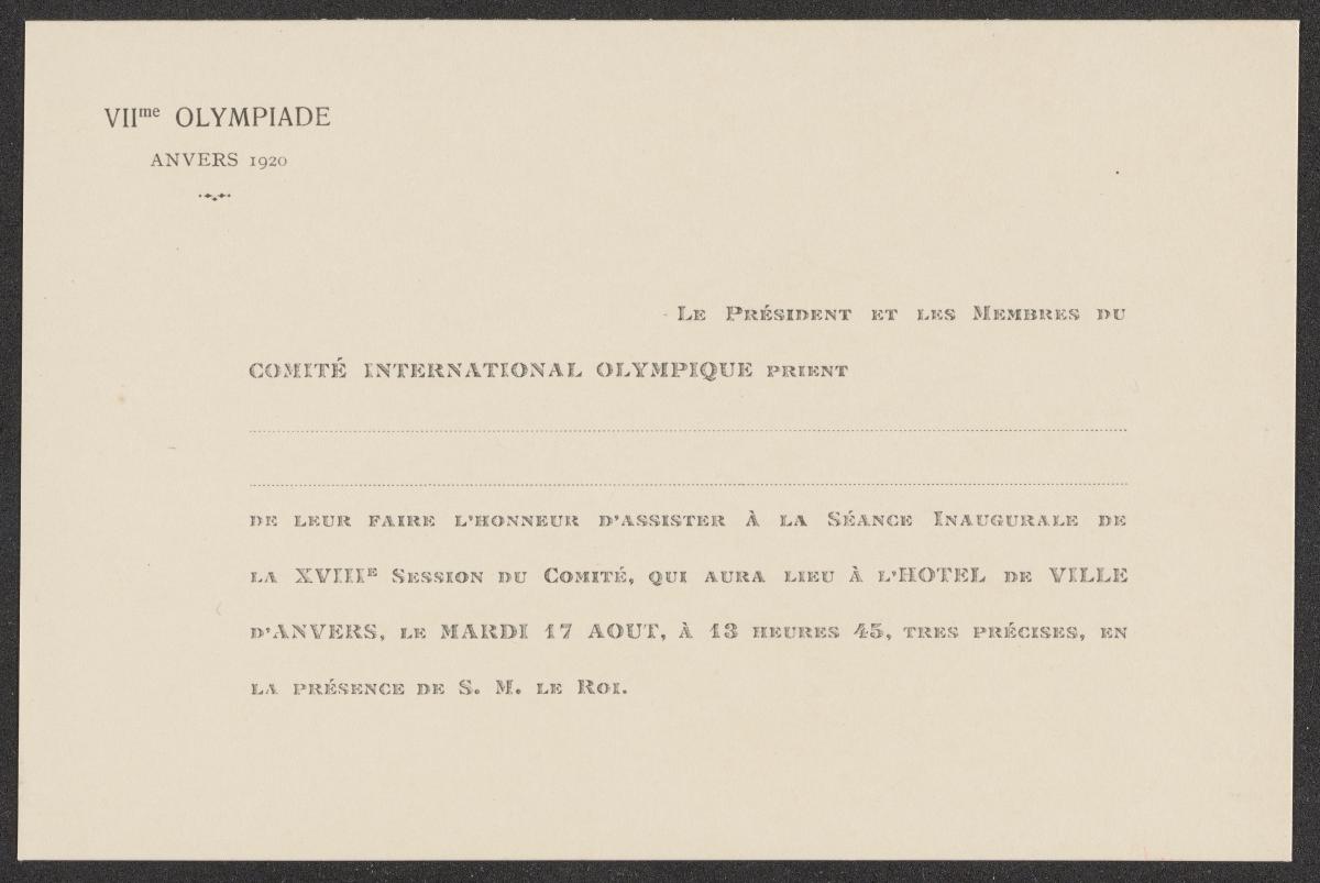 Carte d'invitation vierge. Légende: "VIIme OLYMPIADE / ANVERS 1920 / Le Président et les Membres du / COMITÉ INTERNATIONAL OLYMPIQUE PRIENT / […] / DE LEUR FAIRE L’HONNEUR D’ASSISTER À LA SÉANCE INAUGURALE DE / LA XVIIIe SESSION DU COMITÉ, QUI AURA LIEU à L’HOTEL DE VILLE / D’ANVERS, LE MARDI 17 AOUT, À 13 HEURES 45, TRES PRÉCISES, EN / LA PRÉSENCE DE S. M. LE ROI".