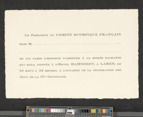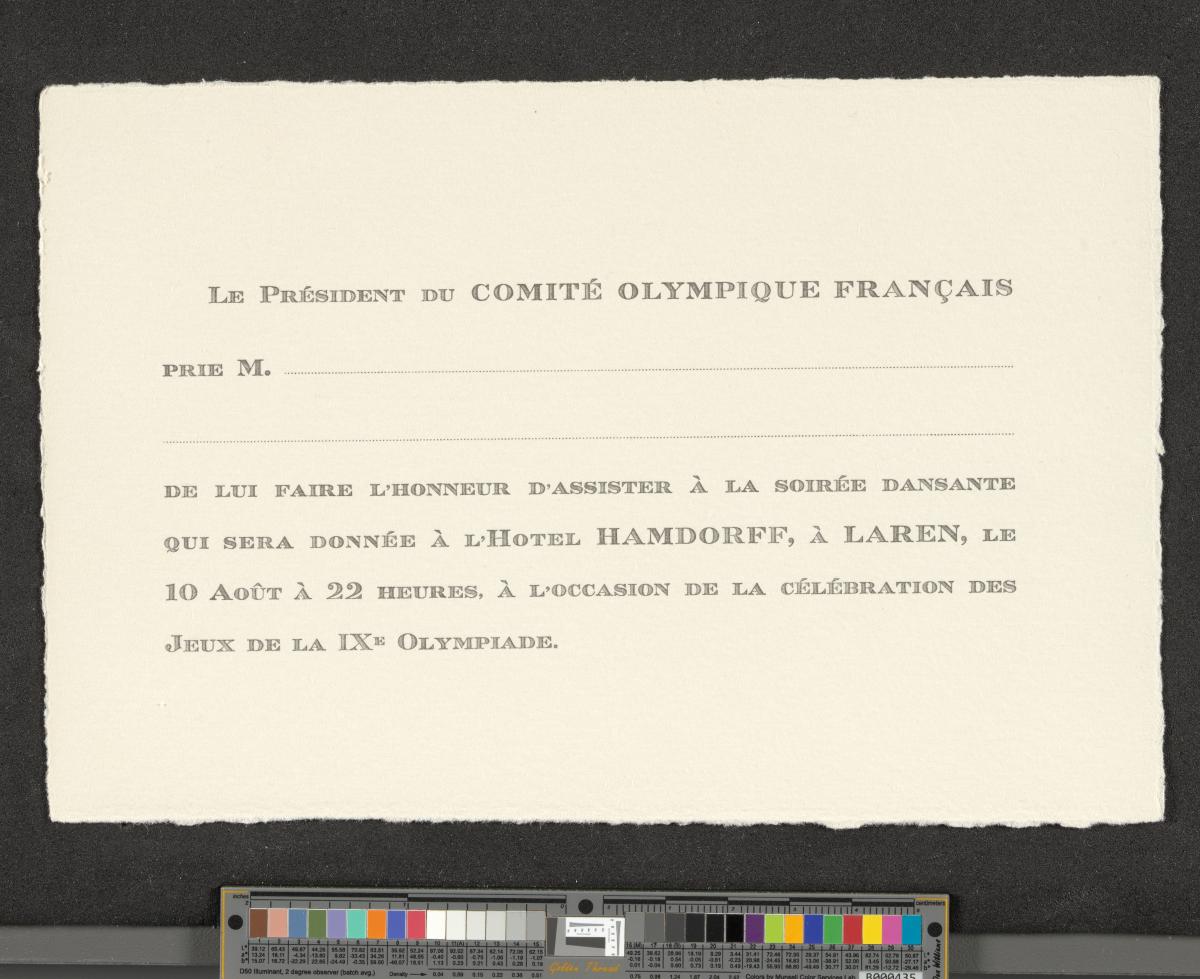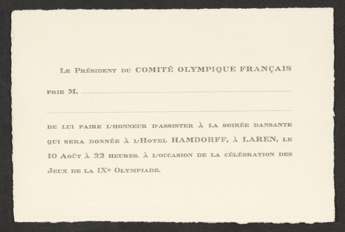 Carton d'invitation vierge. Légende: "Le Président du COMITÉ OLYMPIQUE FRANCAIS / Prie M. [...] / de lui faire l'honneur d'assister à la soirée dansante / qui sera donnée à l'Hotel HAMMDORFF, à LAREN, le / 10 août à 22 heures, à l'occasion de la célébration des / Jeux de la IXe Olympiade".