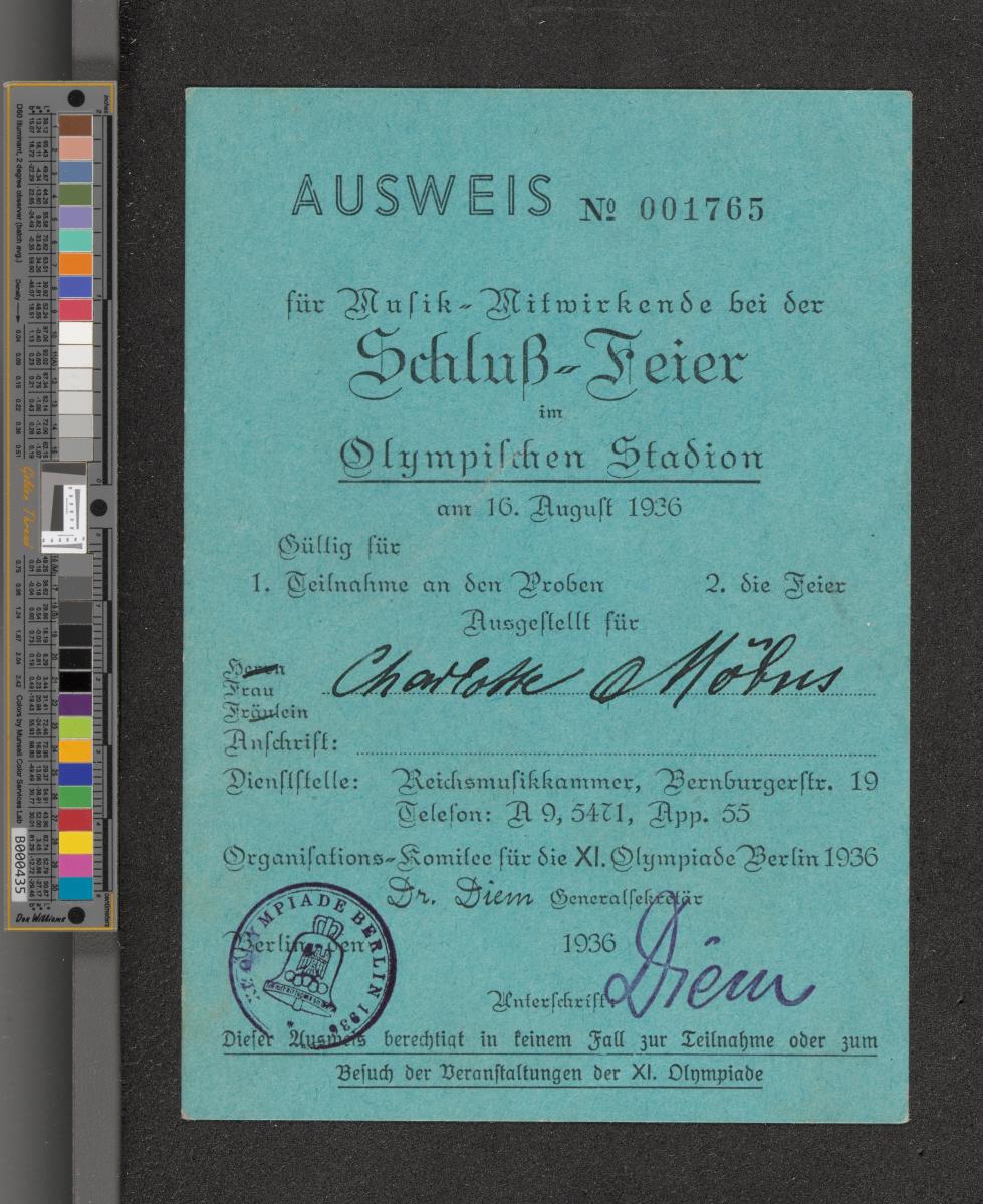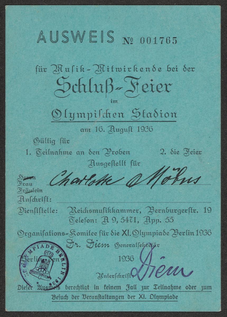 Carte d'identité sans photo, avec signature. Texte: "AUSWEIS N° 001765 / für Musik-Mitwirkende bei der / Schluss-Feier im Olympischen Stadion / am 16. August 1936".