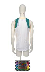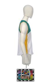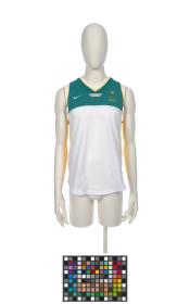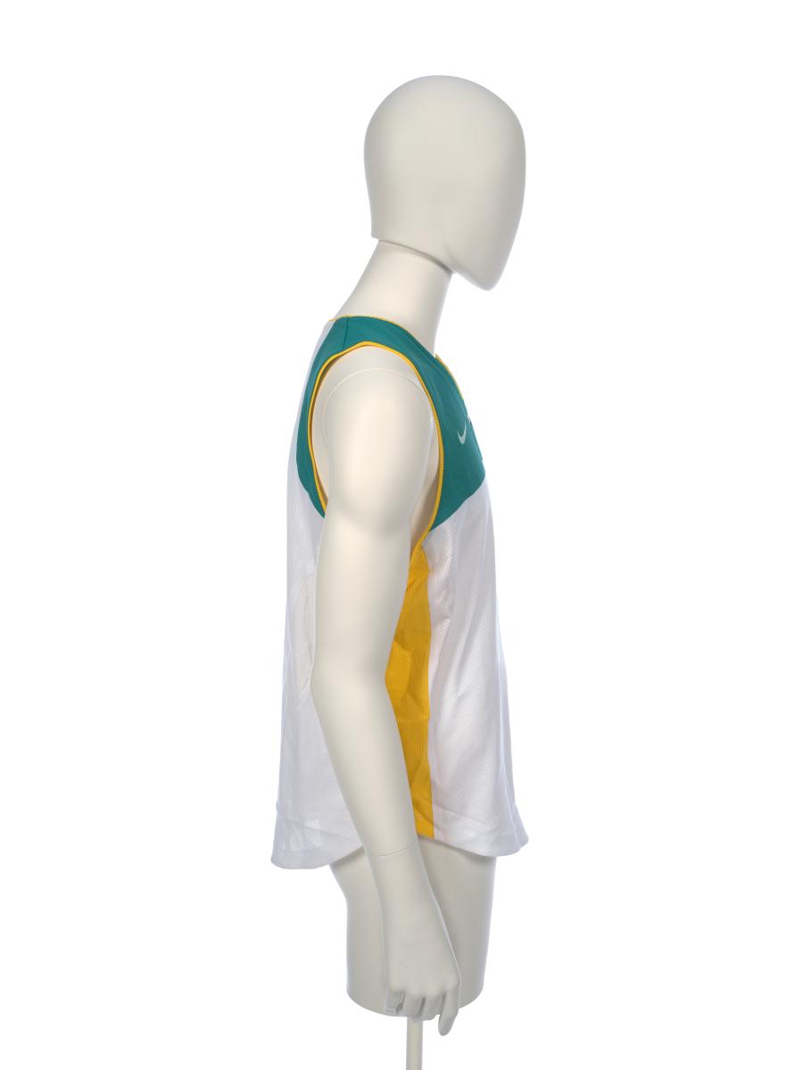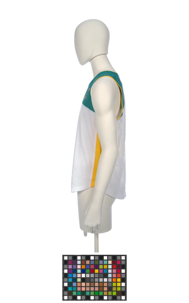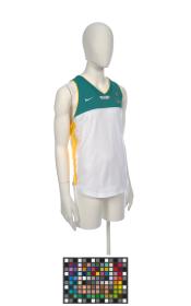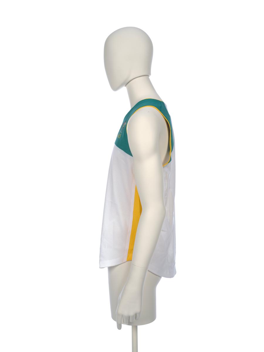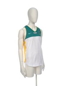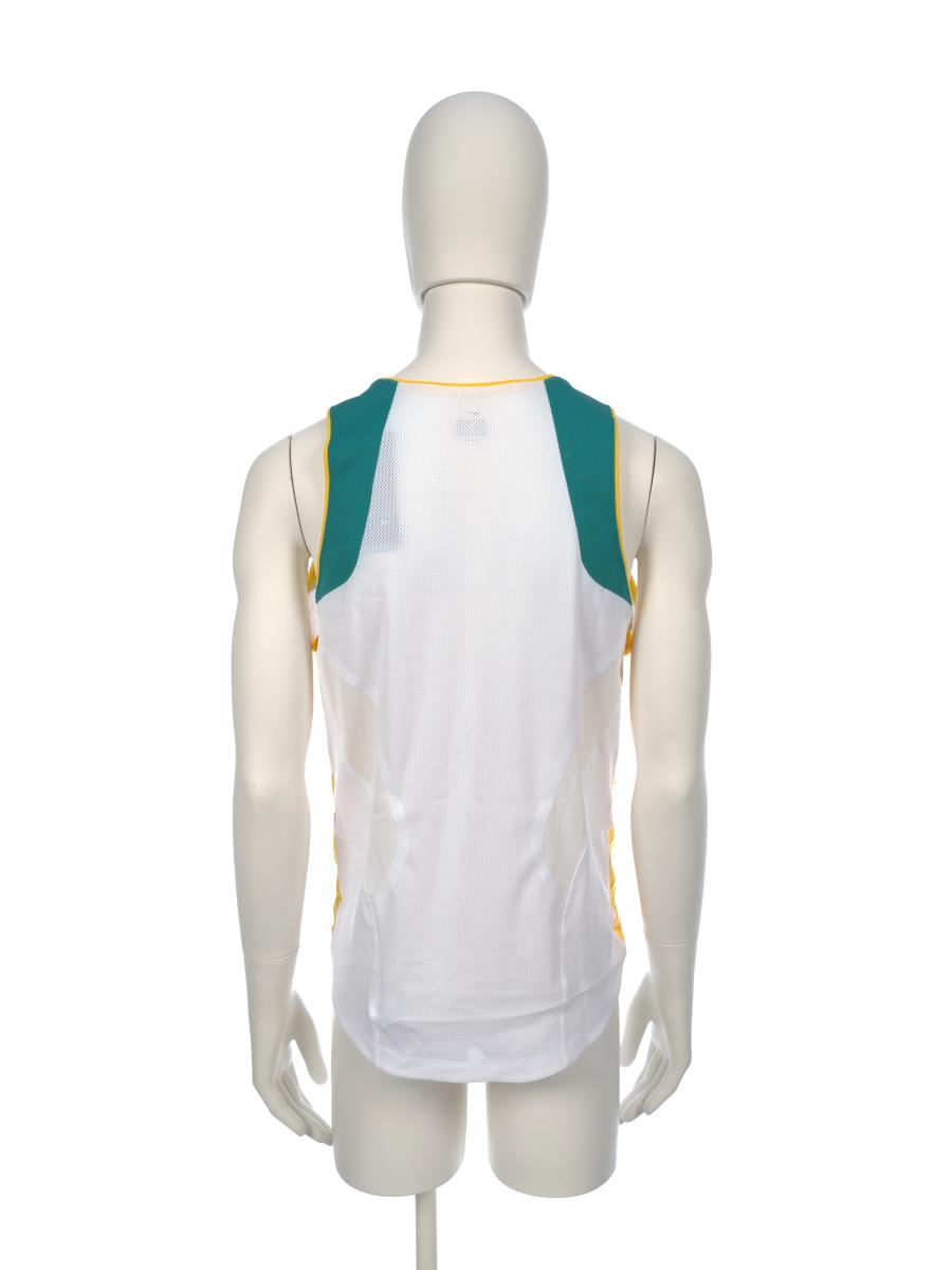 Mailot blanc, vert et jaune avec l'emblème du CNO australien à l'avant accompagné de la légende: "AUS". Taille L.