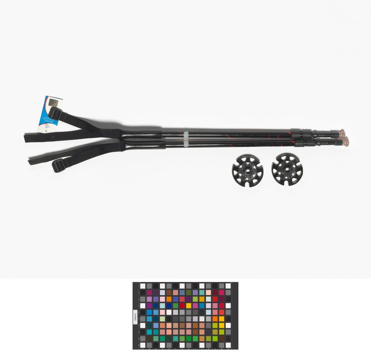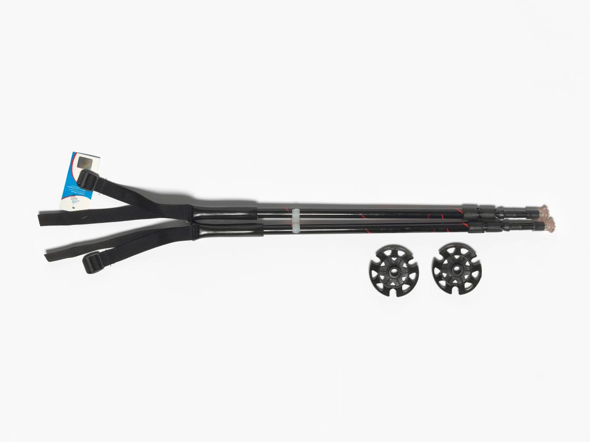 Batons de randonnée téléscopiques avec l'emblème des Jeux et avec un élément de la ligne graphique des Jeux. Etiquette avec hologramme et liste des sites olympiques.