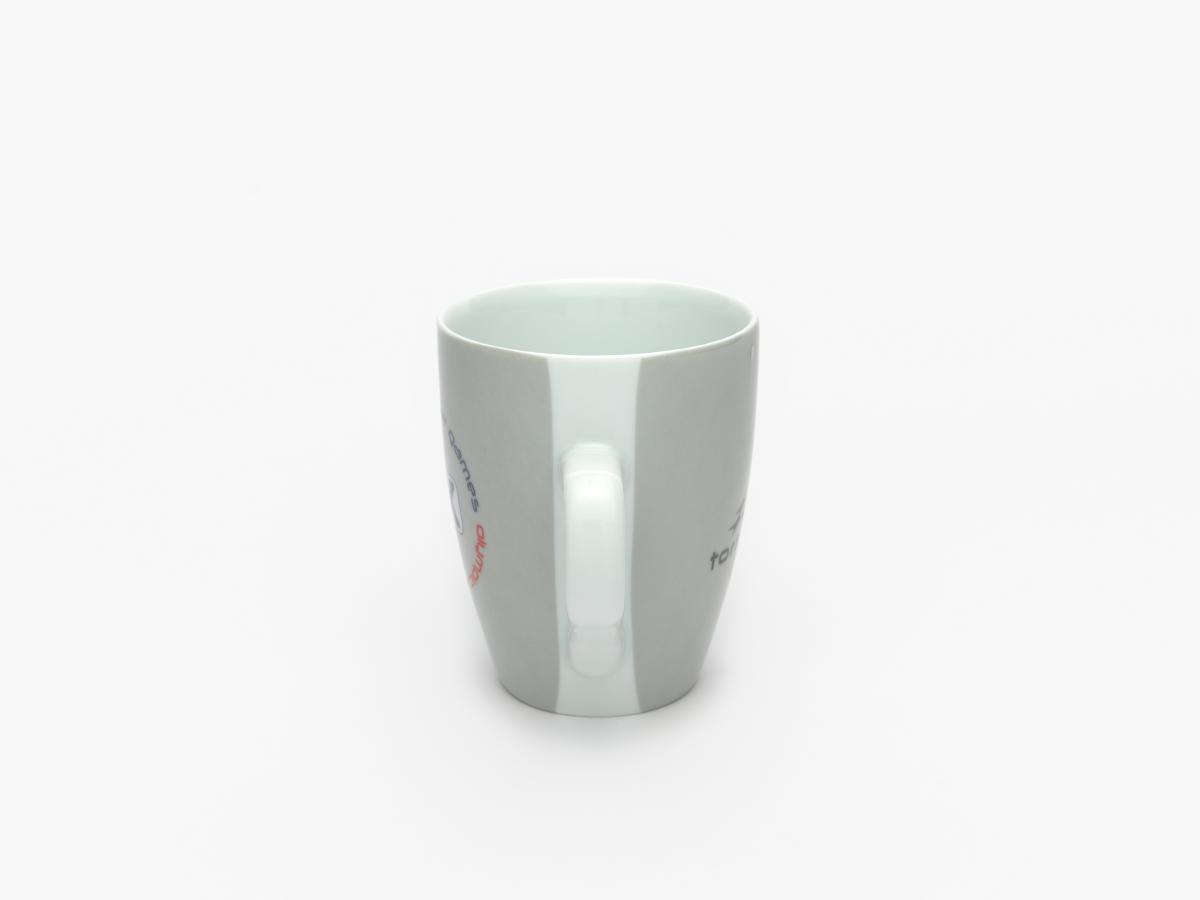 Tasse en porcelaine grise avec le motif XX et la légende: "olympic winter games ; olympic winter games". La tasse se trouve dans une boîte ronde en métal avec l'emblème des Jeux. Au dessous, étiquette hologramme pour lutter contre la contre-façon.
