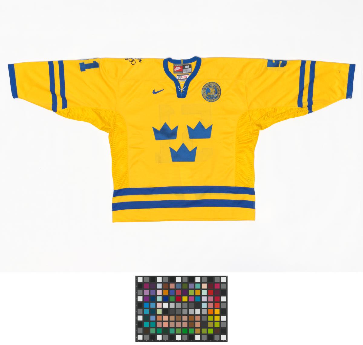 Ecusson du Svenska Ishockey Forbundet avec les armoiries suèdoises (trois couronnes) sur la poitrine, nom du joueur et numéro 51 dans le dos. Taille 56.