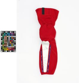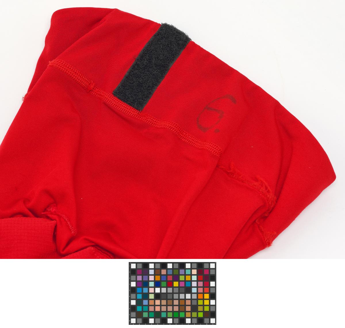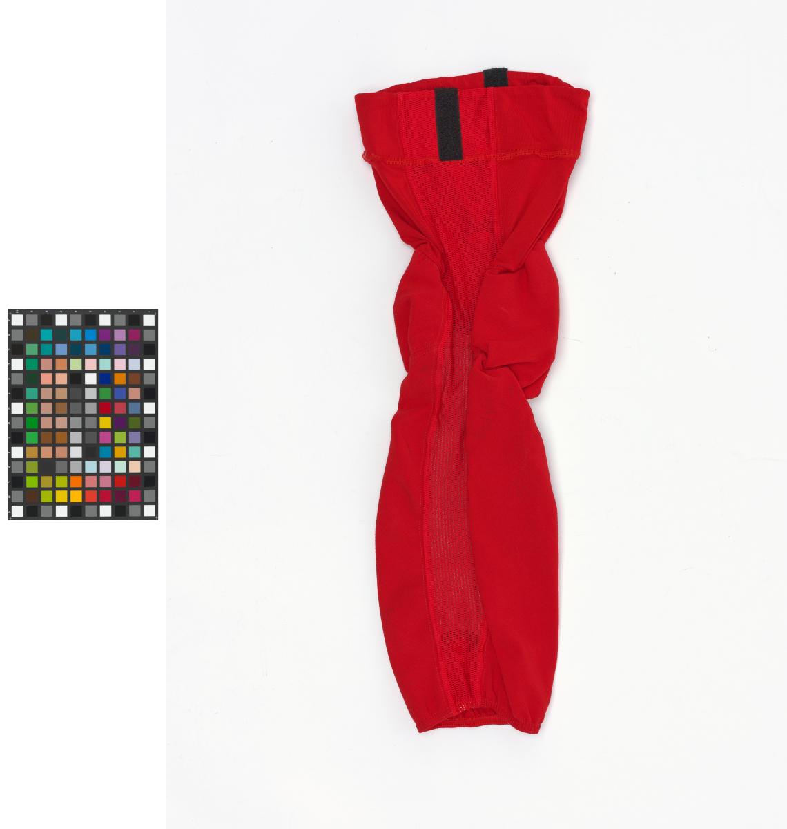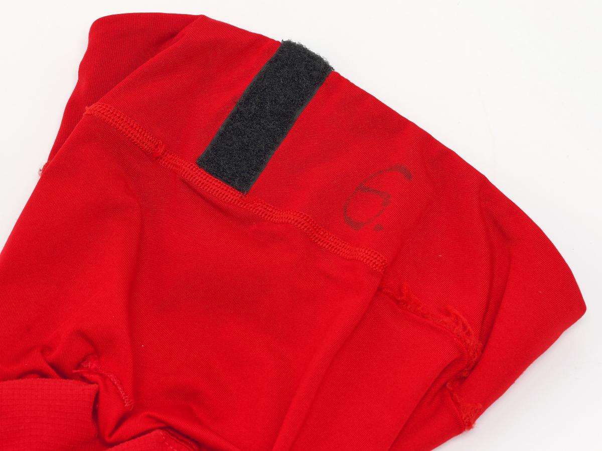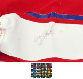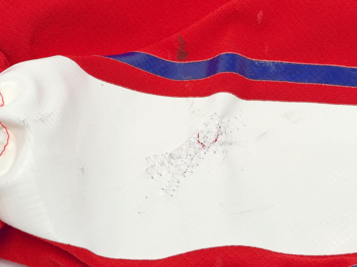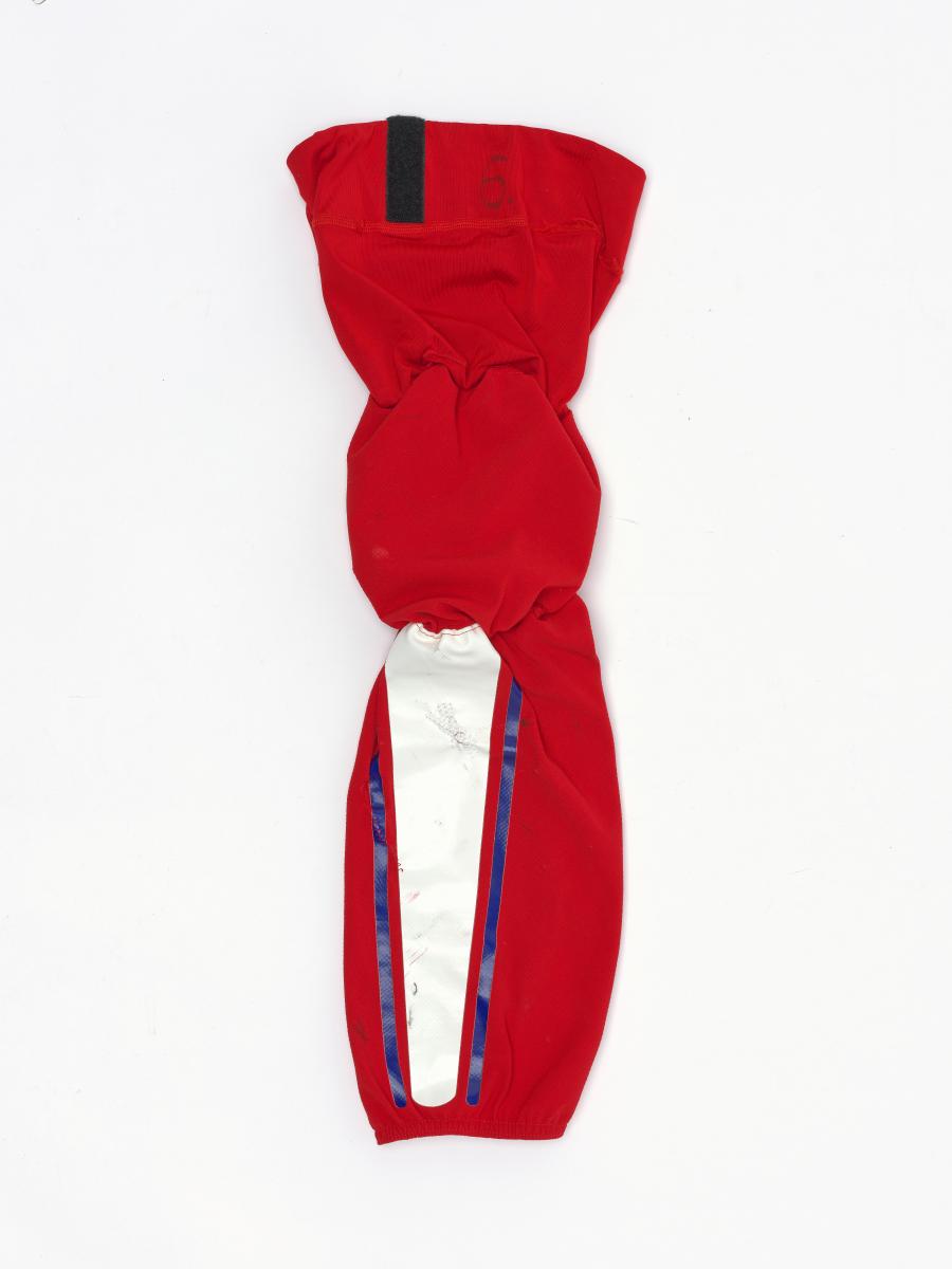 Bas de hockey sur glace rouges et blancs. N° 6 écrit à la main.