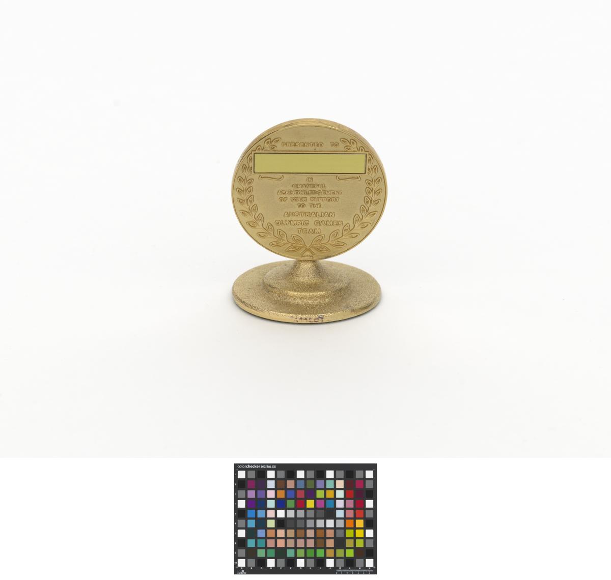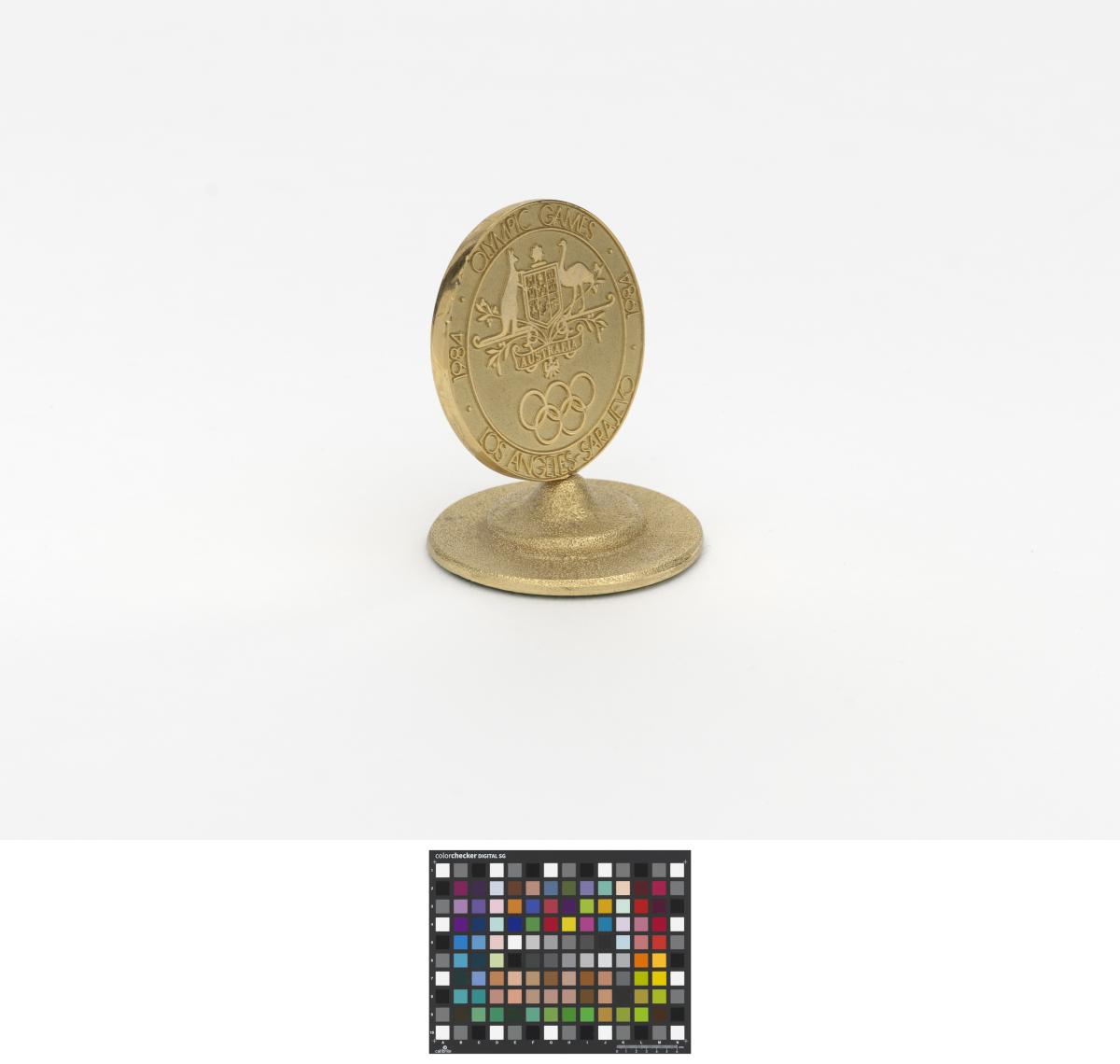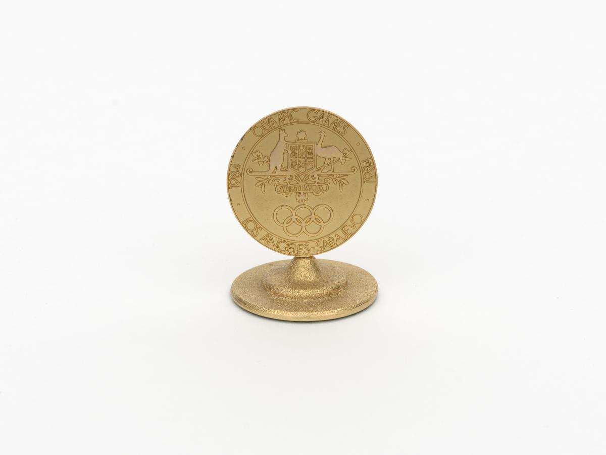 Avers: emblème du comité national olympique australien et légende: "· 1984 · OLYMPIC GAMES · ; LOS ANGELES{-}SARAJEVO · 1984". Revers: couronne de laurier et légende: "PRESENTED TO / IN / GRATEFUL / ACKNOWLEDGEMENT / OF YOUR SUPPORT / TO THE / AUSTRALIAN / OLYMPIC GAMES / TEAM".