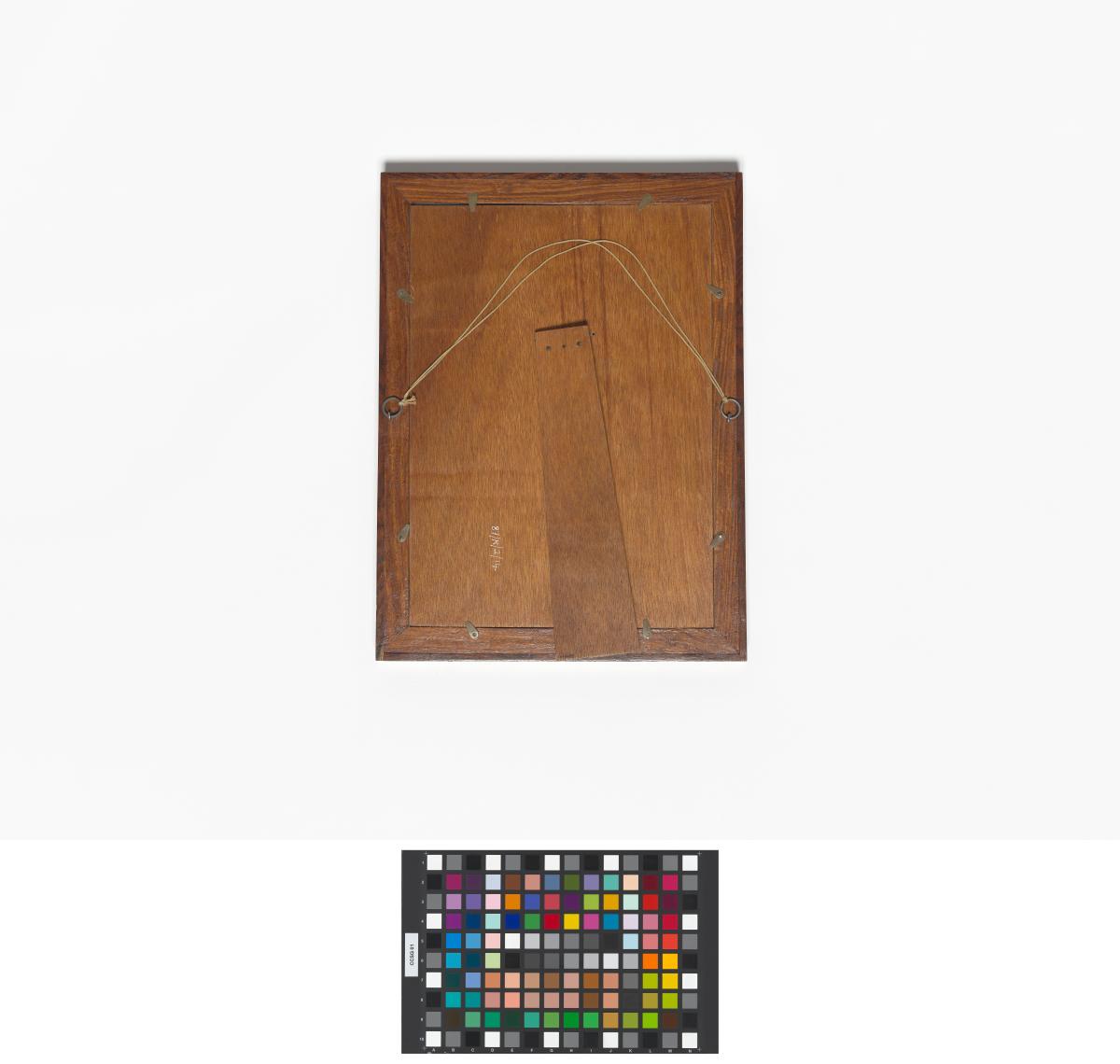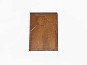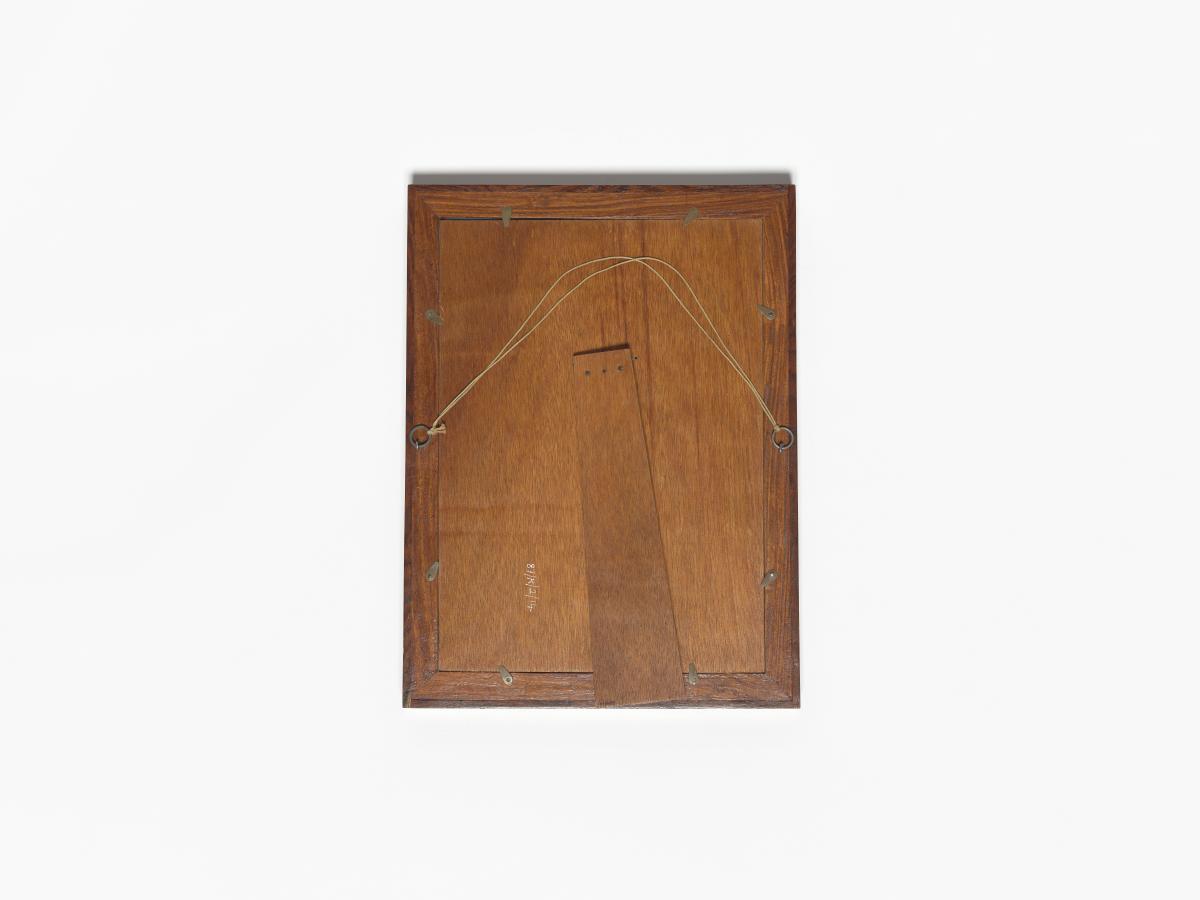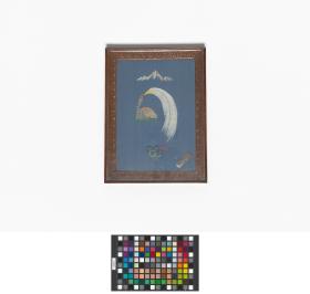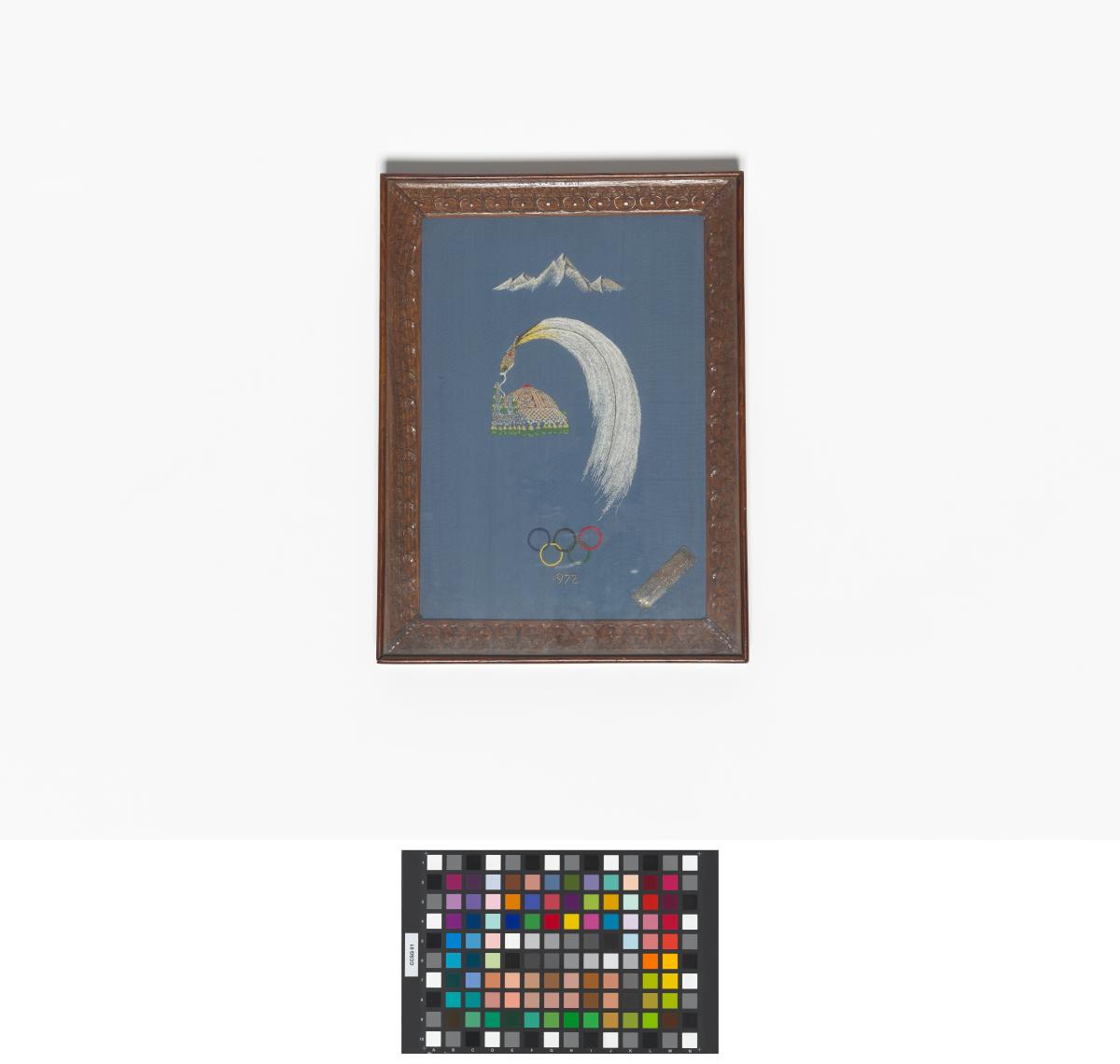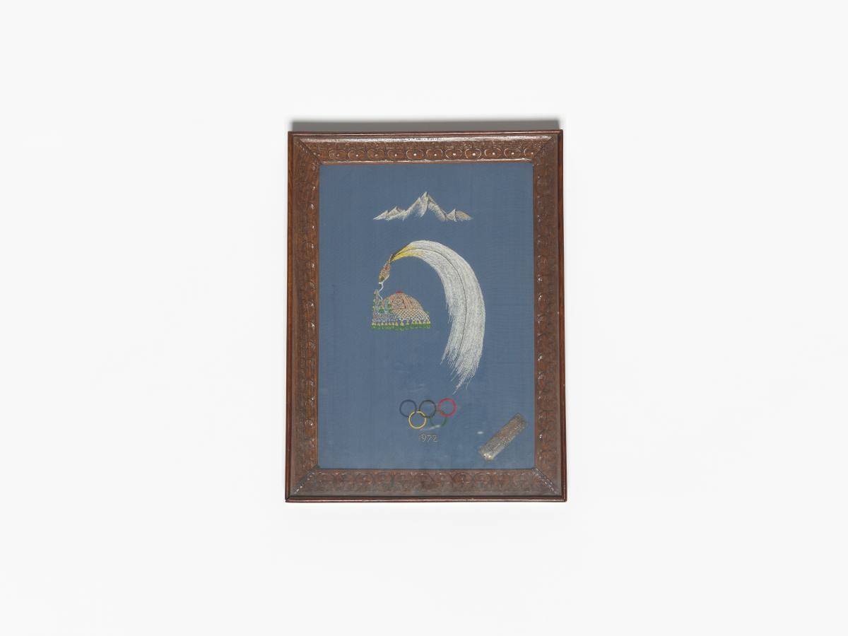 Broderie représentant la chaîne himalayenne, la couronne royale népalaise, emblème du Comité National Olympique avec le symbole olympique. Légende : "With the compliments of Nepal Olympic Committee 1972". Avec support et corde de suspension.