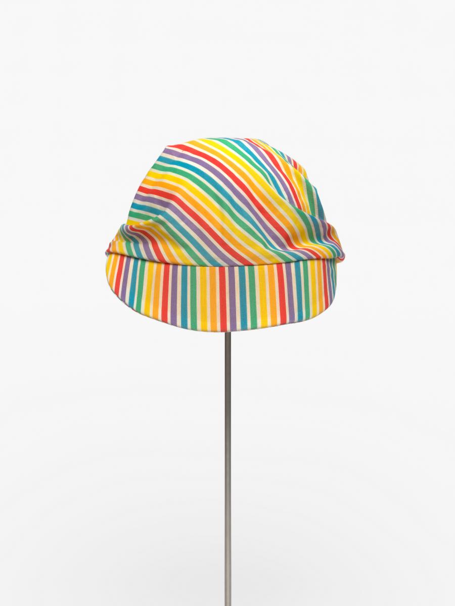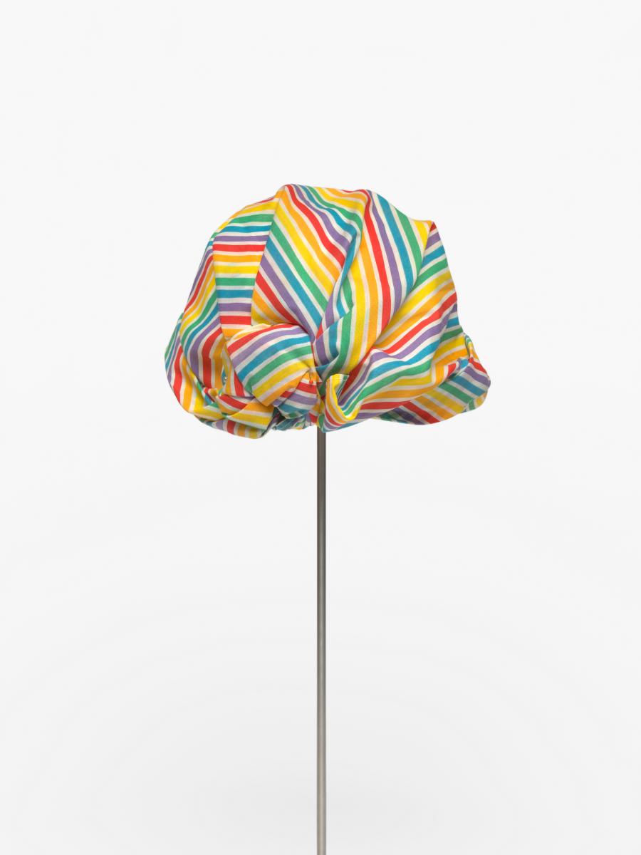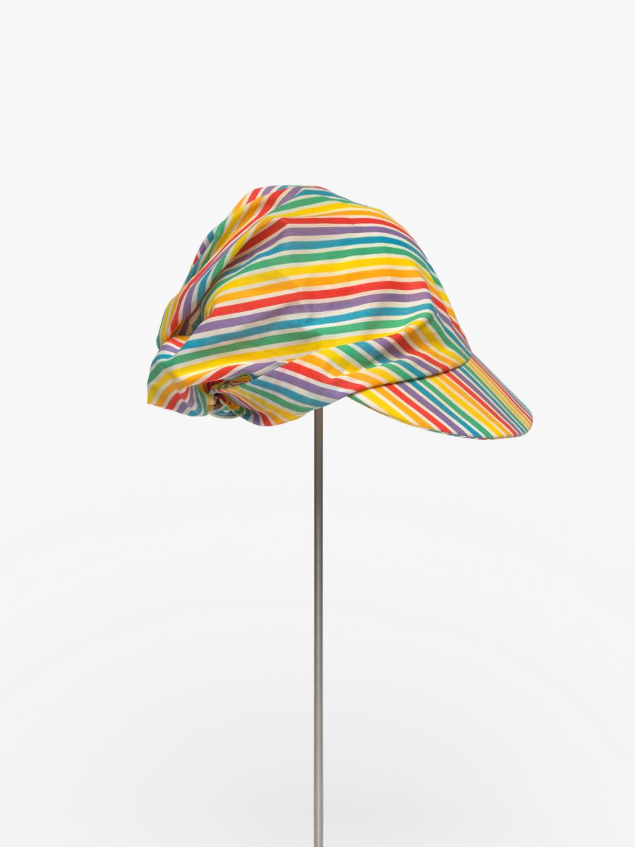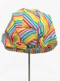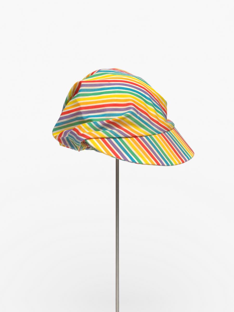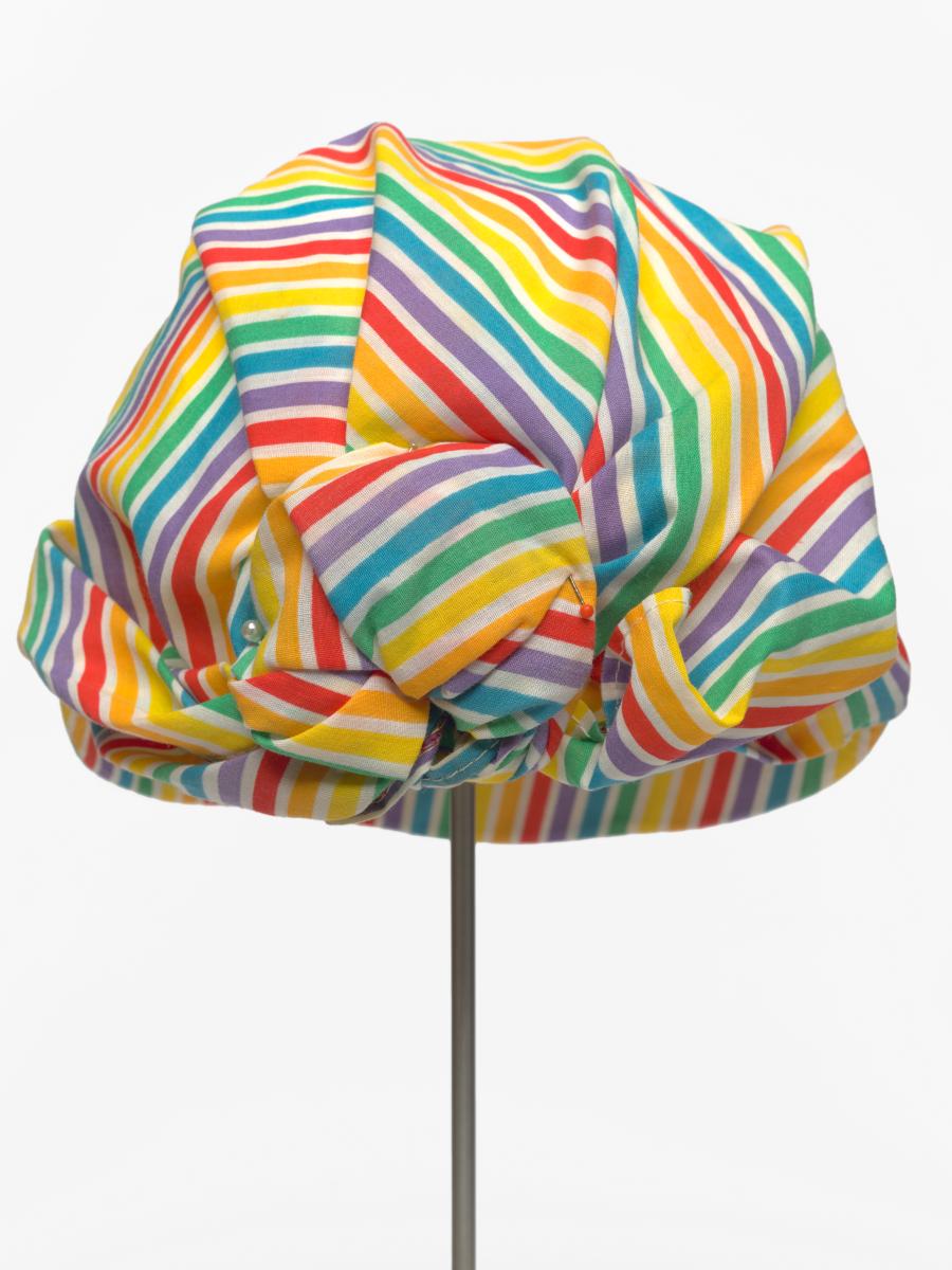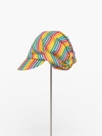 Casquette rayée avec noeud derrière la tête. Le noeud est décoré d'une agrafe terminée par une perle.