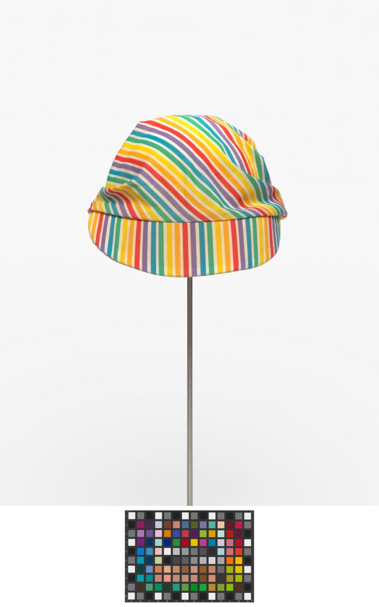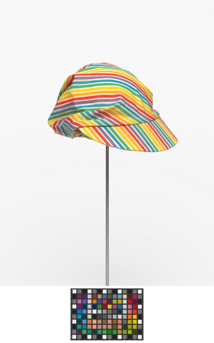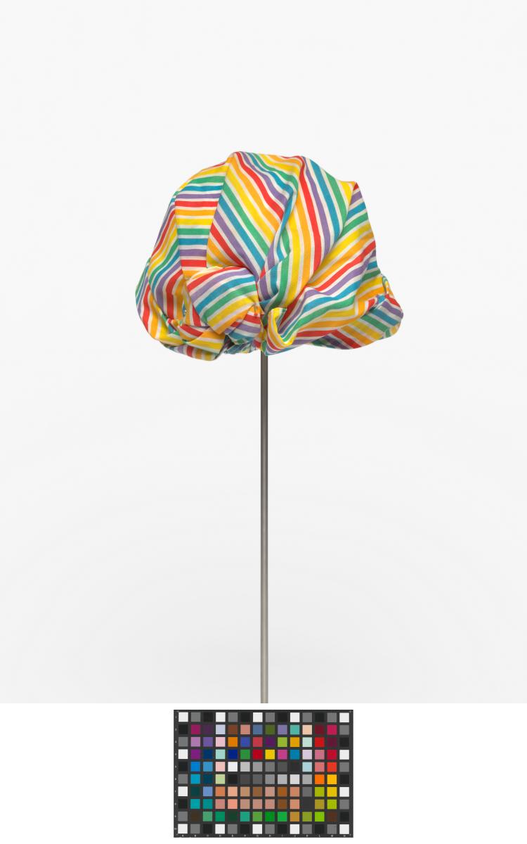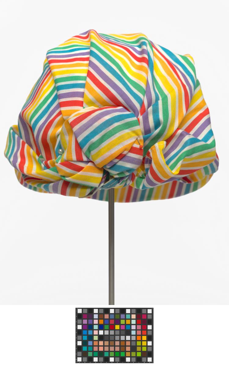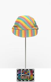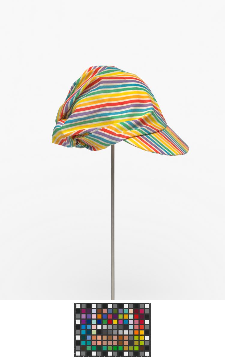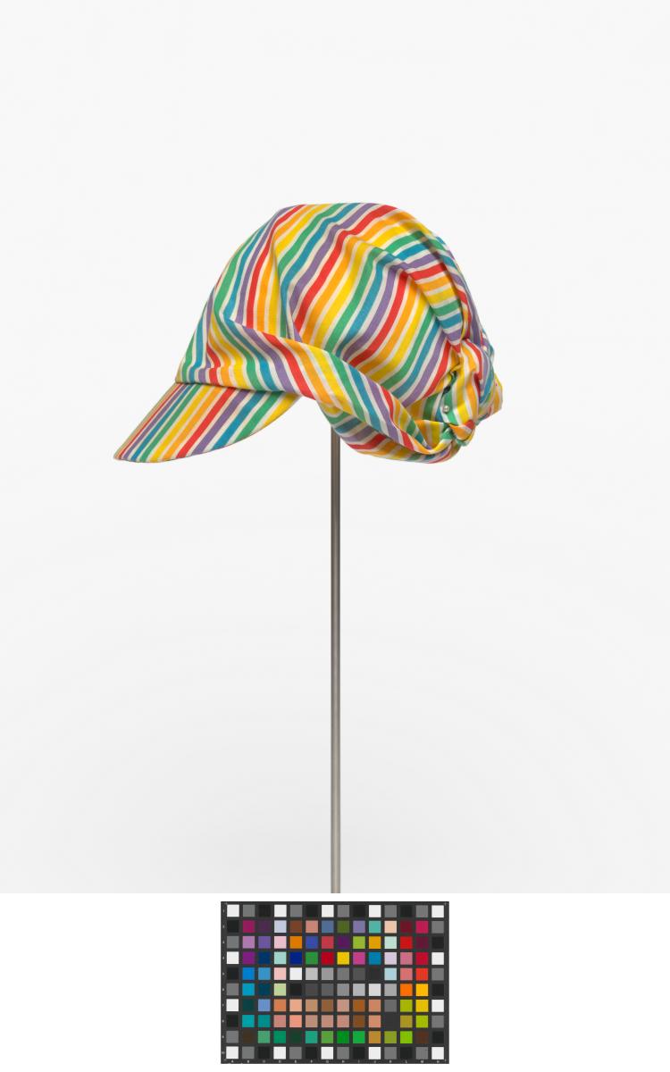 Casquette rayée avec noeud derrière la tête. Le noeud est décoré d'une agrafe terminée par une perle.