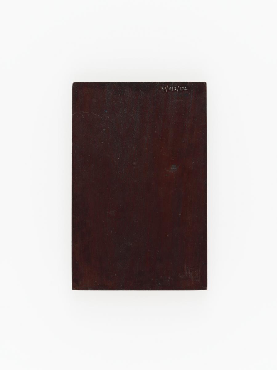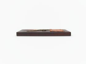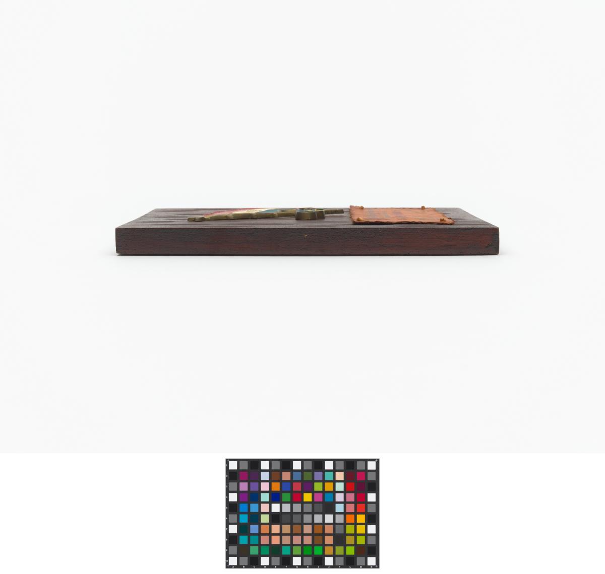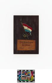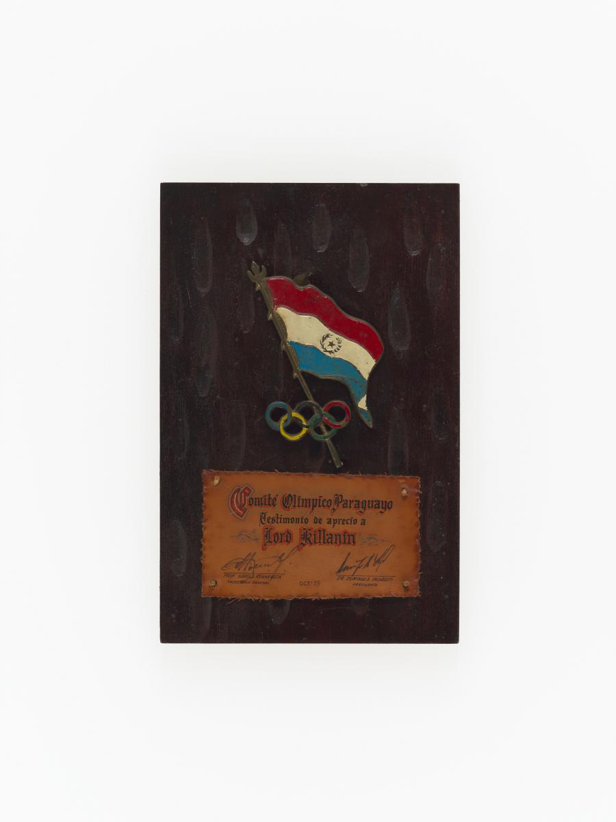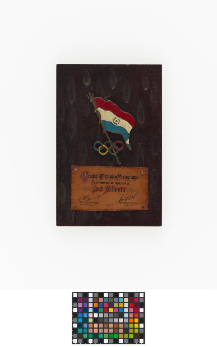Plaque en bois avec drapeau du Paraguay et symbole olympique et légende: "Comité Olimpico Paraguyo / Testimonio de aprecio a / Lord Killanin / oct' 75 / Prof. Harold Ronnebeck / secretario general / Dr. Domingo A Inchausti / Presidente".