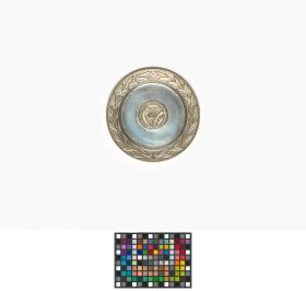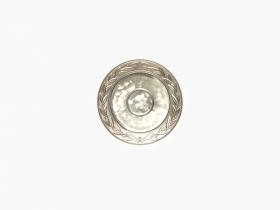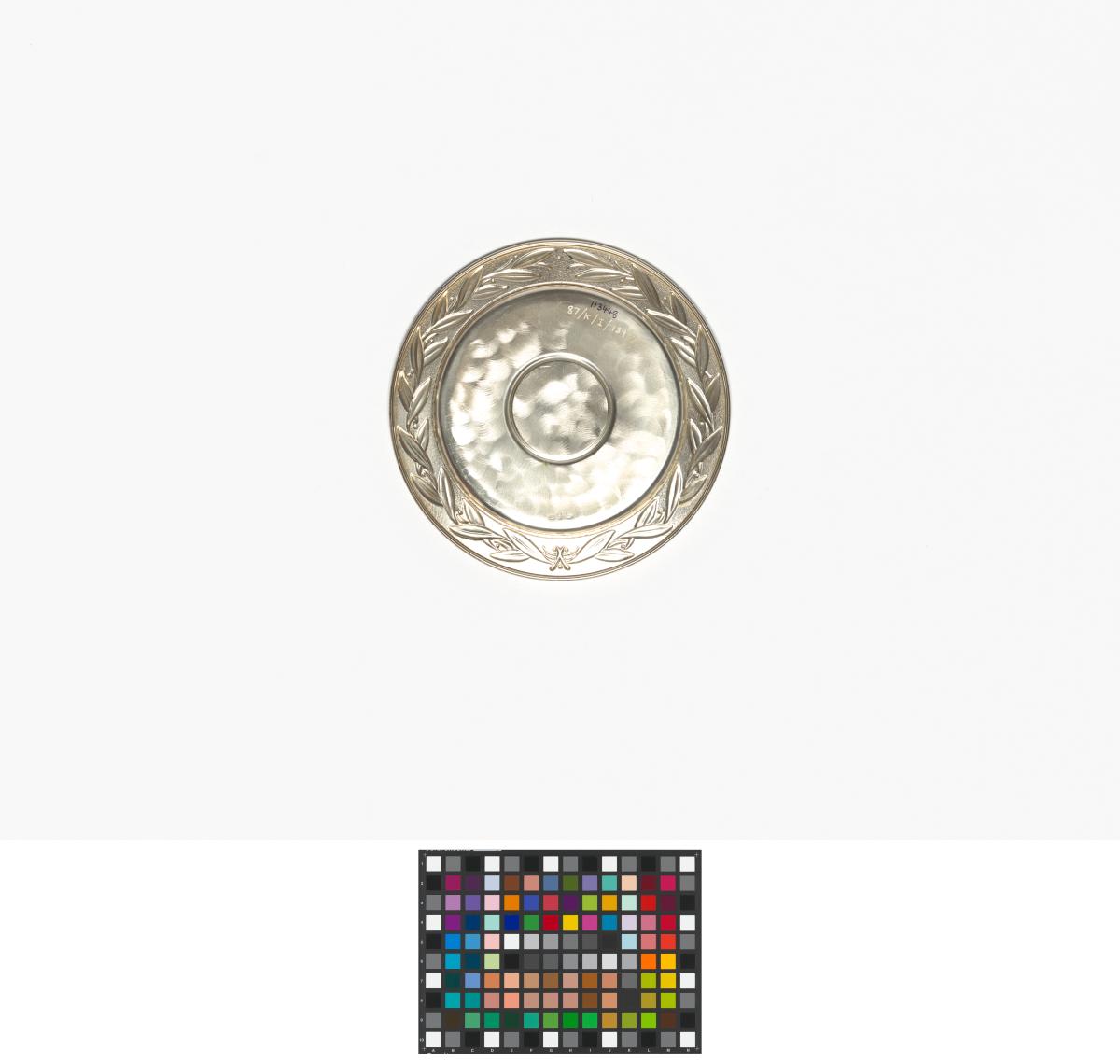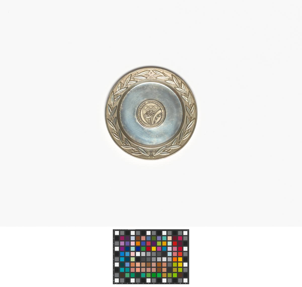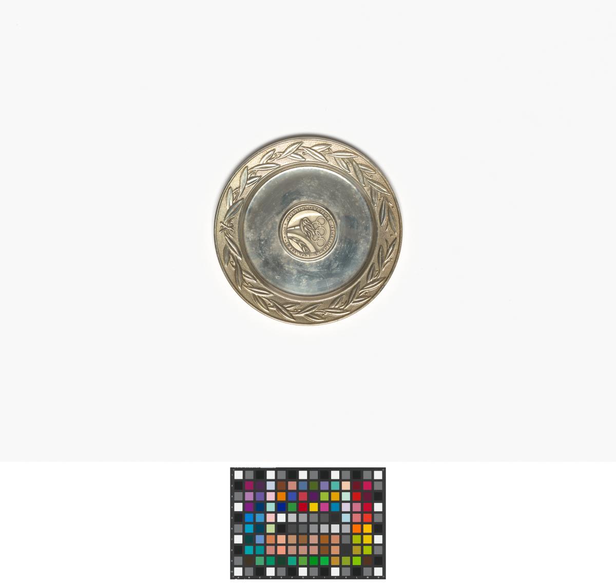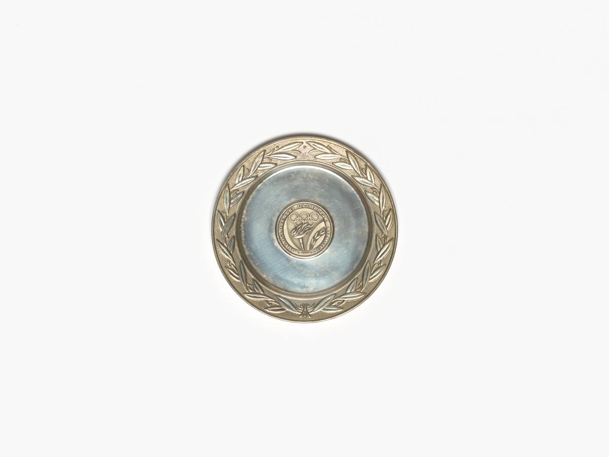 Assiette avec le motif central représentant la vasque avec une branche d'olivier et les anneaux olympiques, légende: "Jugoslovenski Olimpijski Komitet". Frise avec le motif d'une couronne d'olivier.