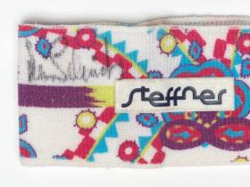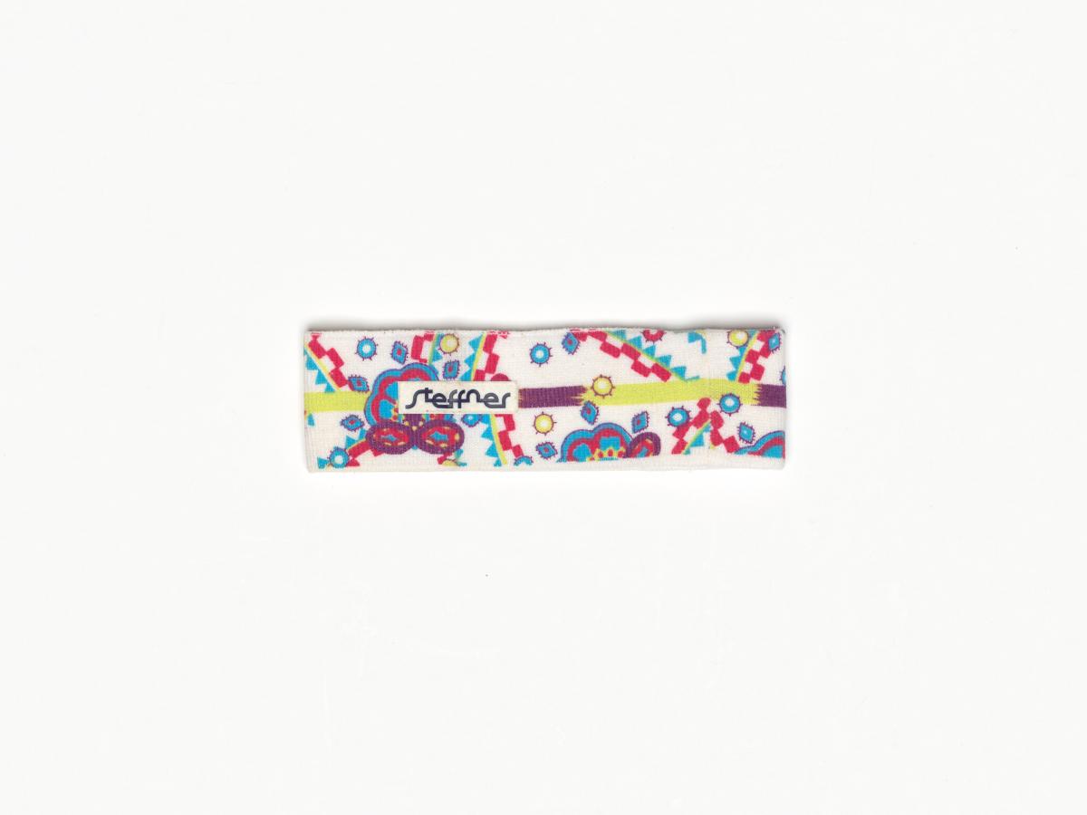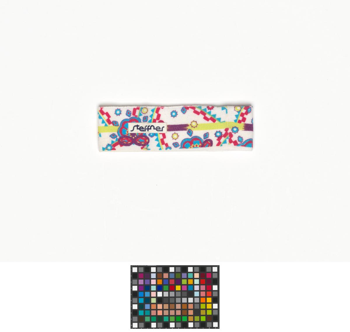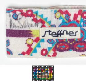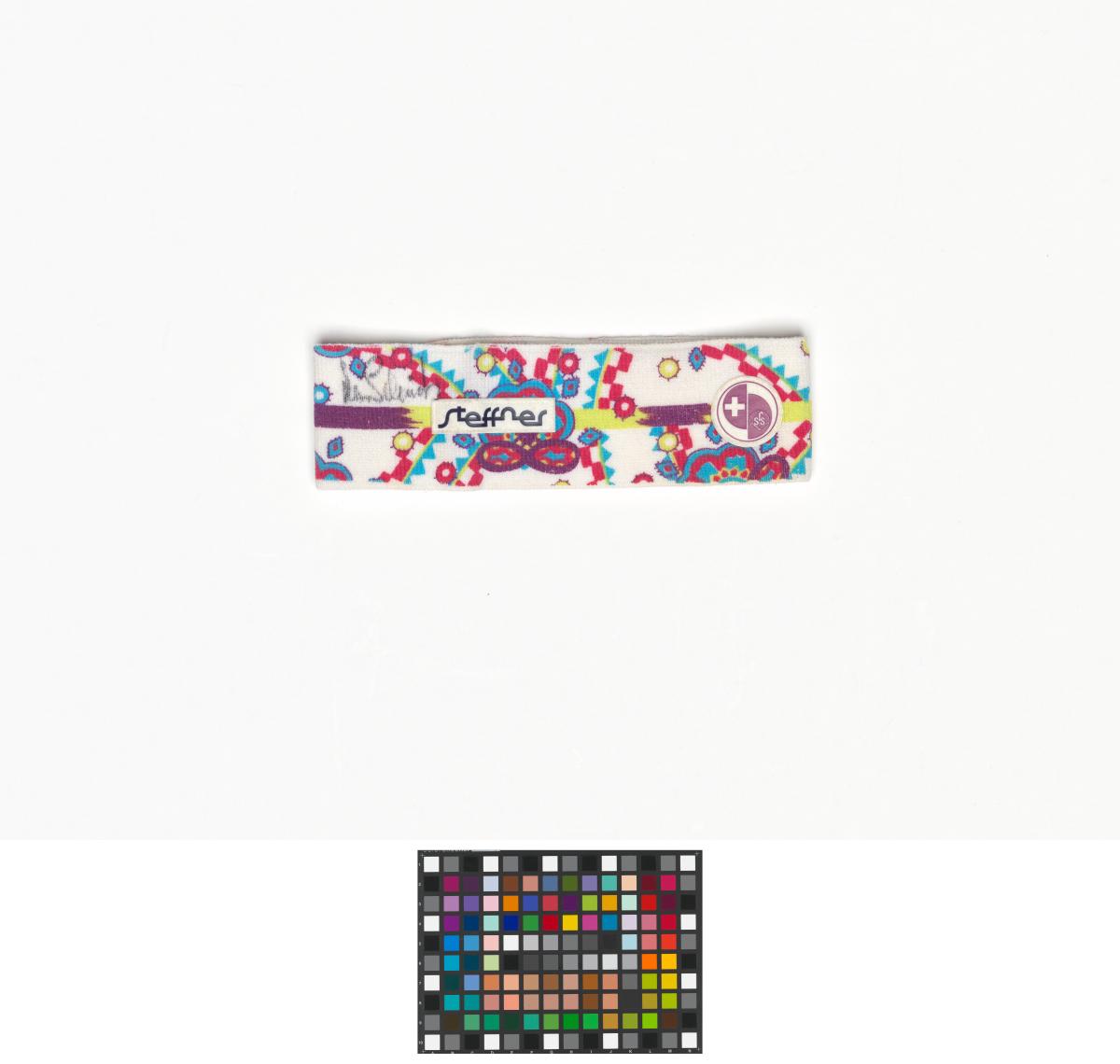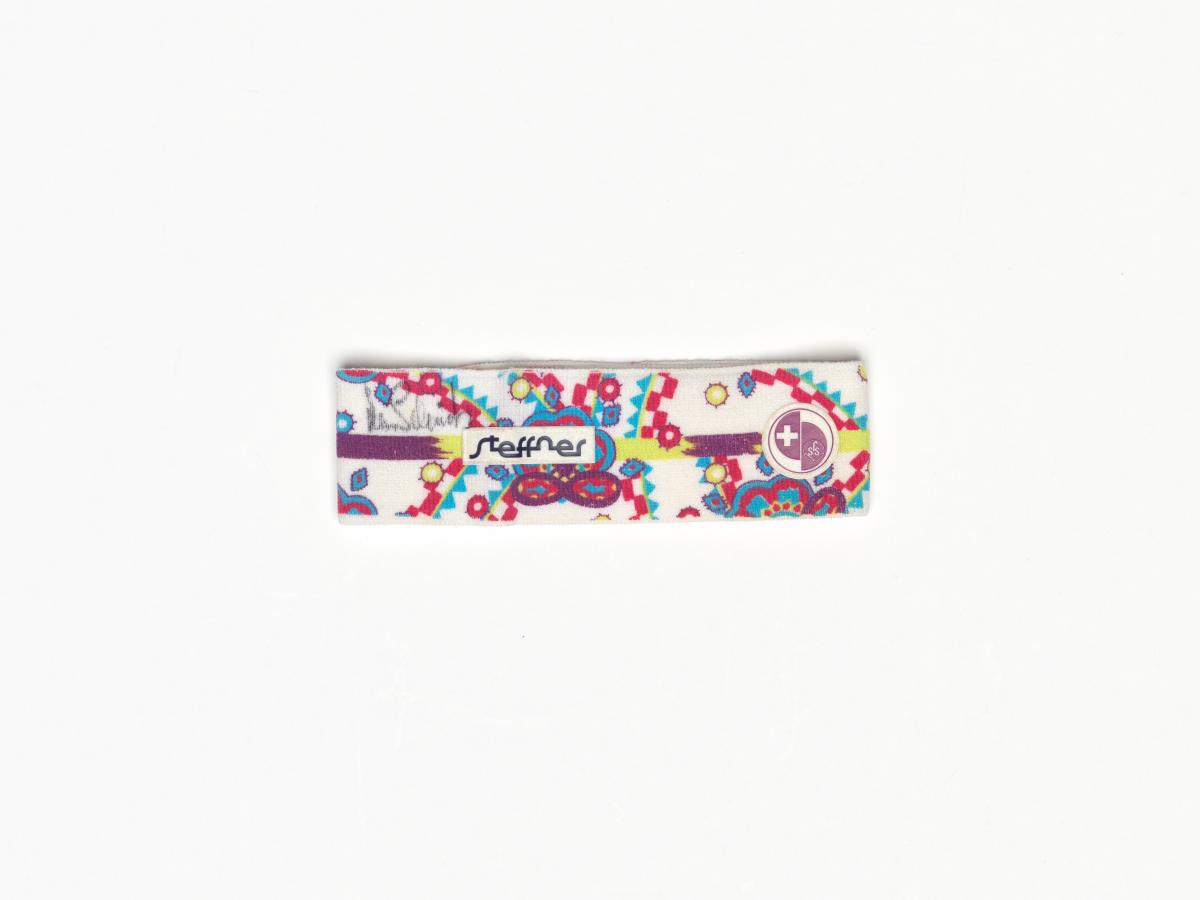 Bandeau avec des motifs géométriques, le logo de la Fédération suisse de ski et la dédicace de l'athlète.