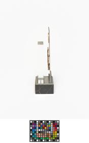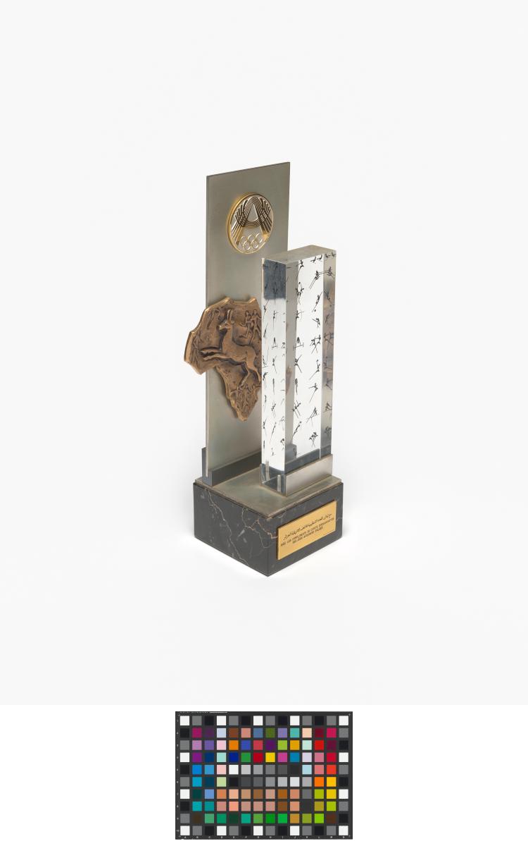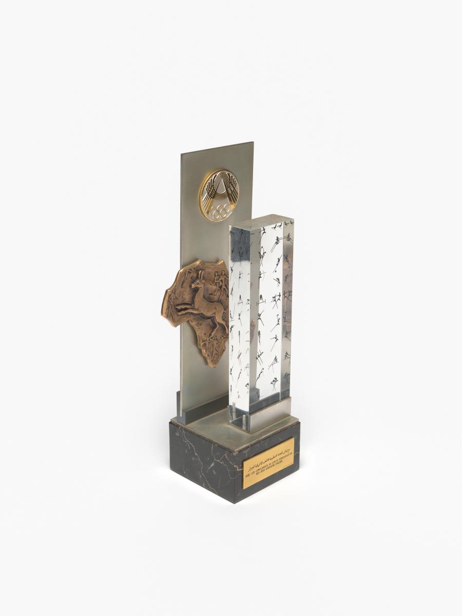 Plaque avec l'emblème des Jeux et le continent africain. Plaque avec les pictogrammes sur socle avec la légende : "Avec les compliments du comité d'organisation / des Jeux Africains d'Alger".