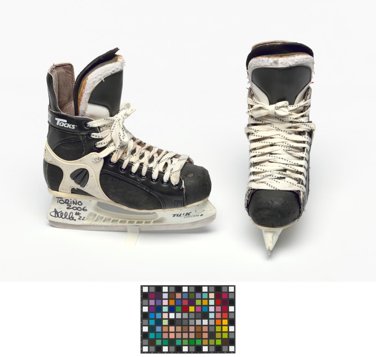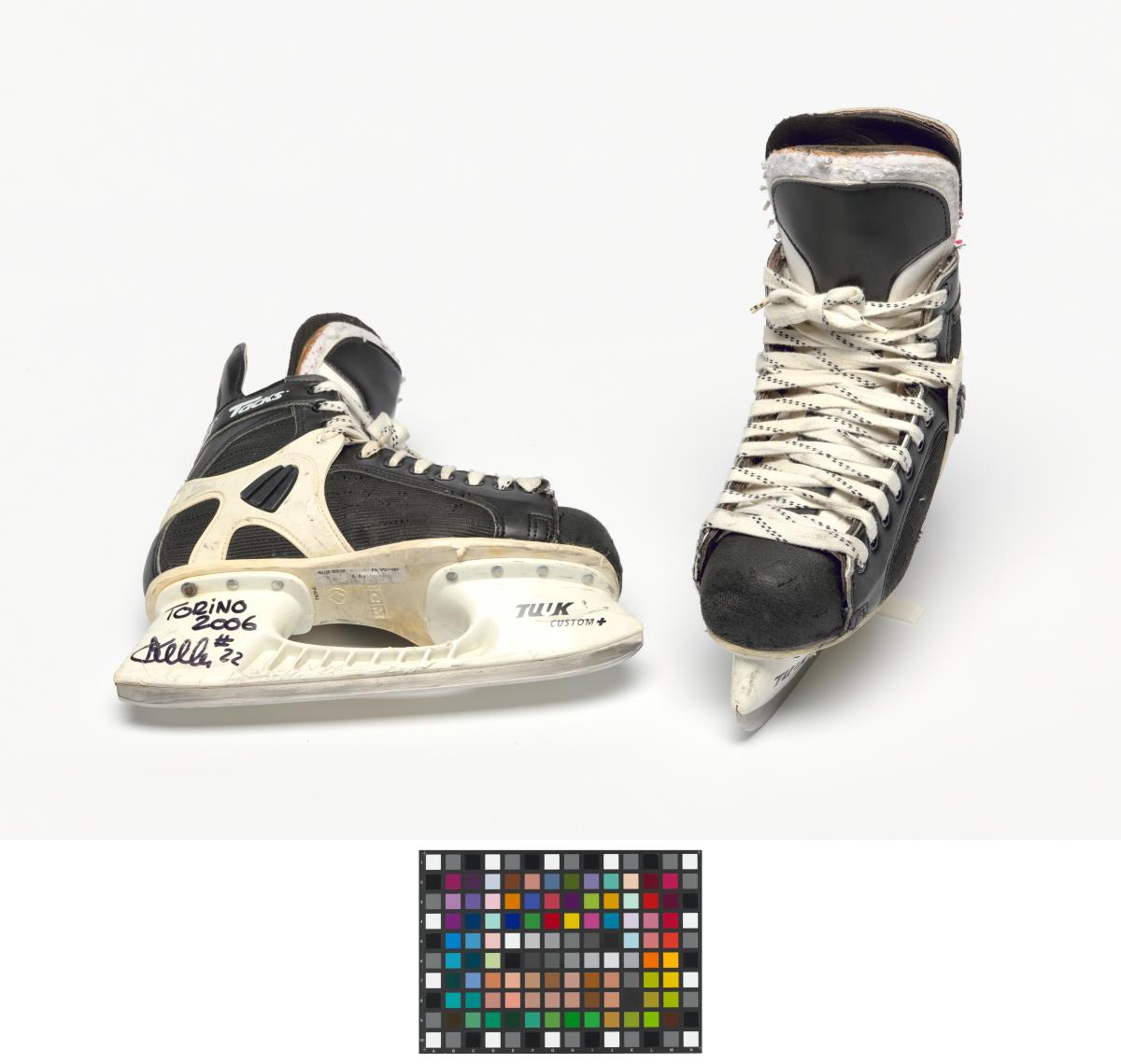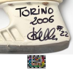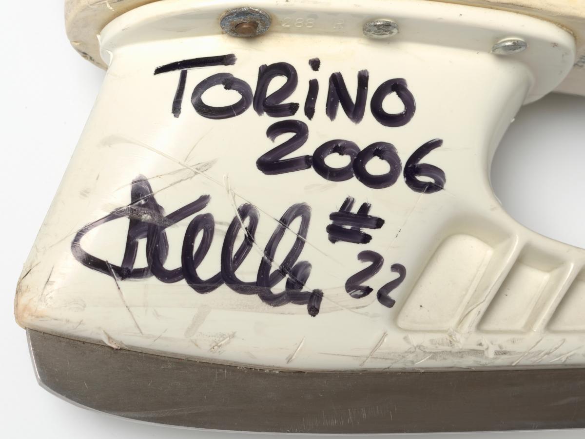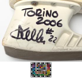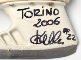 Modèle "Custom Fit Tacks" avec doublure en Ultima Dry, porte-lame blanc Tuuk "Custom Plus". Dédicace de l'athlète: "TORINO / 2006 / #22" avec la signature de l'athlète. Taille 9 (Canada).