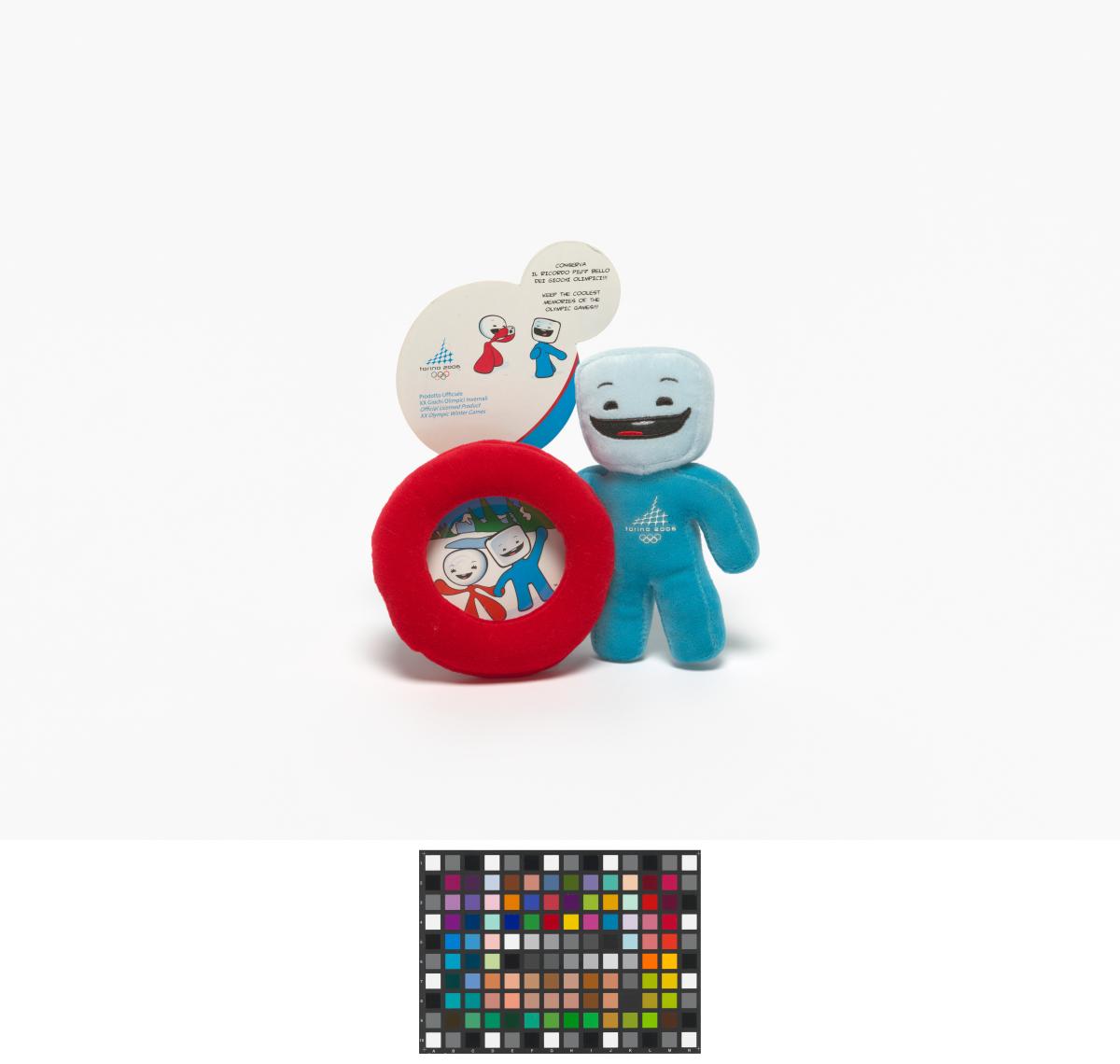 Cadre avec Gliz, une des mascottes des Jeux. Emballage carton original avec étiquette hologramme et la légende: "CONSERVA / IL RICORDO PIÙ? BELLO / DEI GIOCHI OLIMPICI !!! / KEEP THE COOLEST / MEMORIES OF THE / OLYMPIC GAMES!!!".