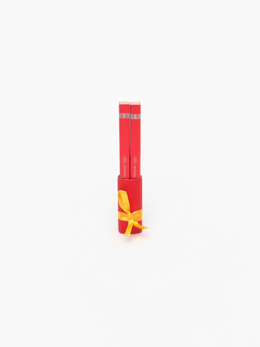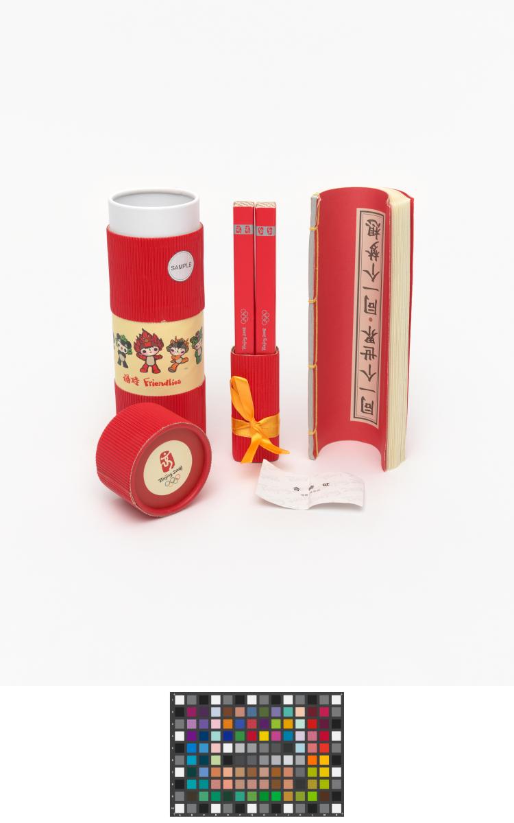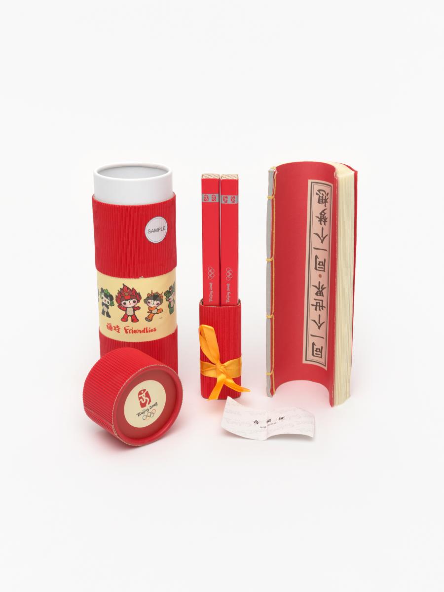 Set de 2 plumes et carnet avec légende (chinois): "One World, One Dream". Emballage original avec les mascottes des jeux. Légende: "Friendlies".