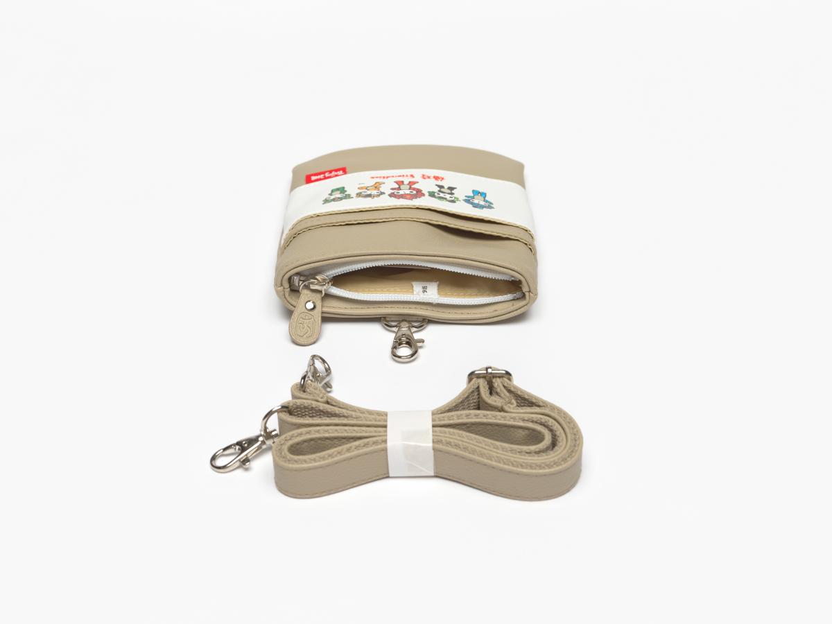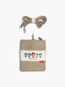Petit sac blanc et beige avec les cinq mascottes des Jeux. Légende: "Friendlies".