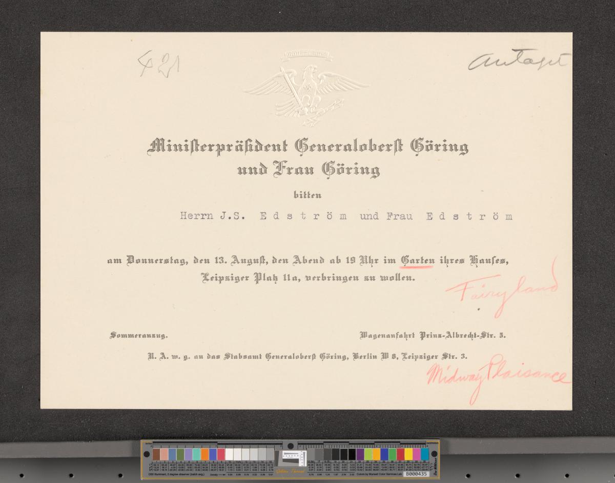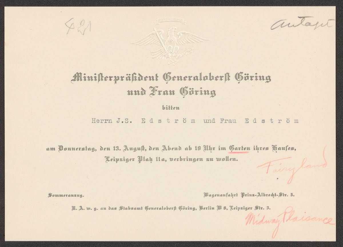 Invitation pour la soirée offerte par le Ministerpräsident Generaloberst Göring et son épouse, adressée à J. S. Edström et son épouse, le 13 août 1936. Armoiries gaufrée de l'Allemagne. Inscriptions manuscrites.