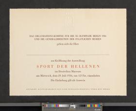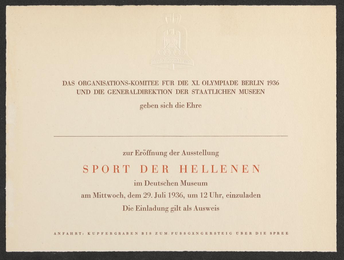 Berlin 1936, invitation pour le vernissage de l'exposition "Le sport des Hellènes".