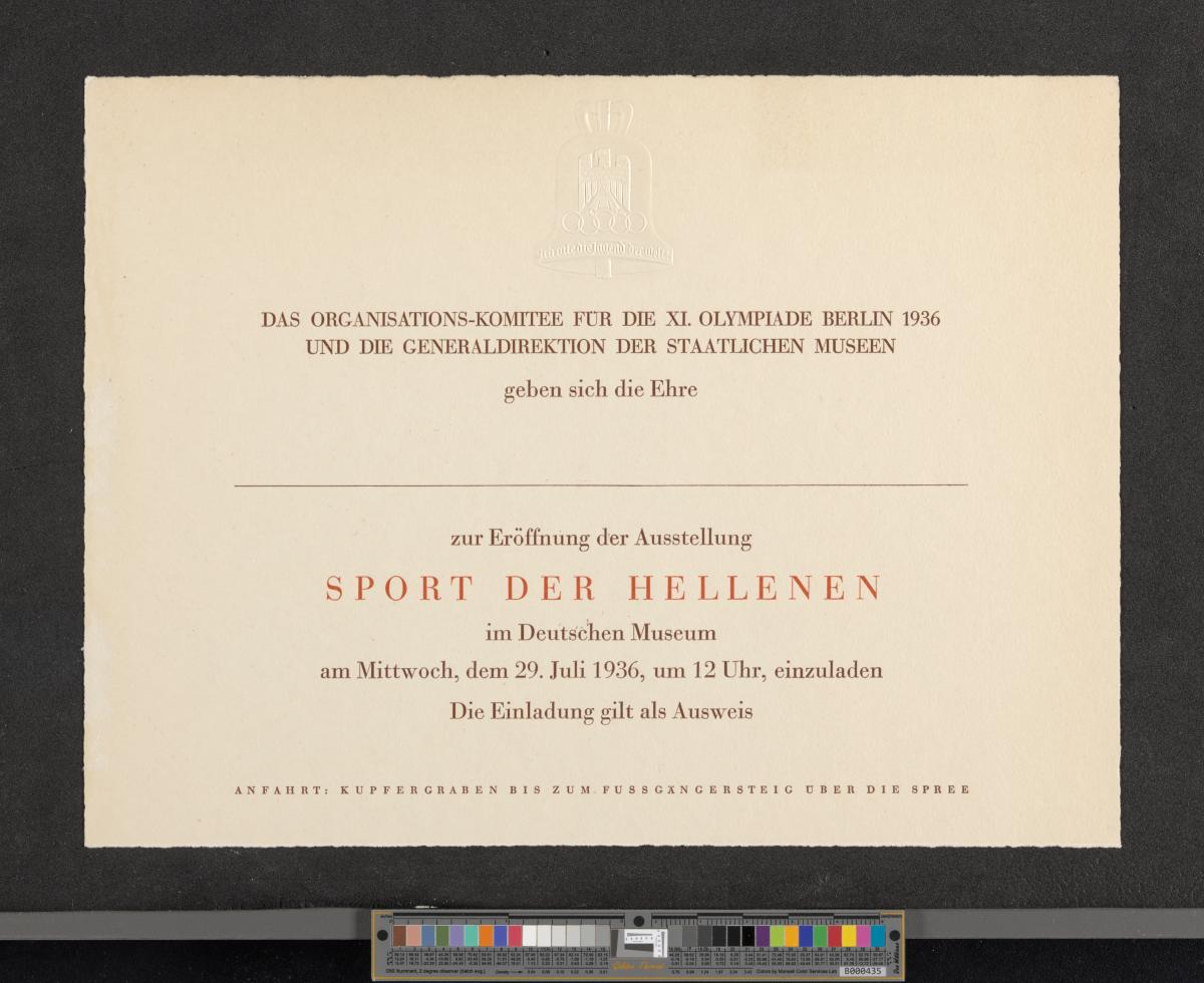 Invitation pour le vernissage de l'exposition "Sport der Hellenen" au Deutschen Museum, le 29 juillet 1936. Emblème des Jeux gaufré.