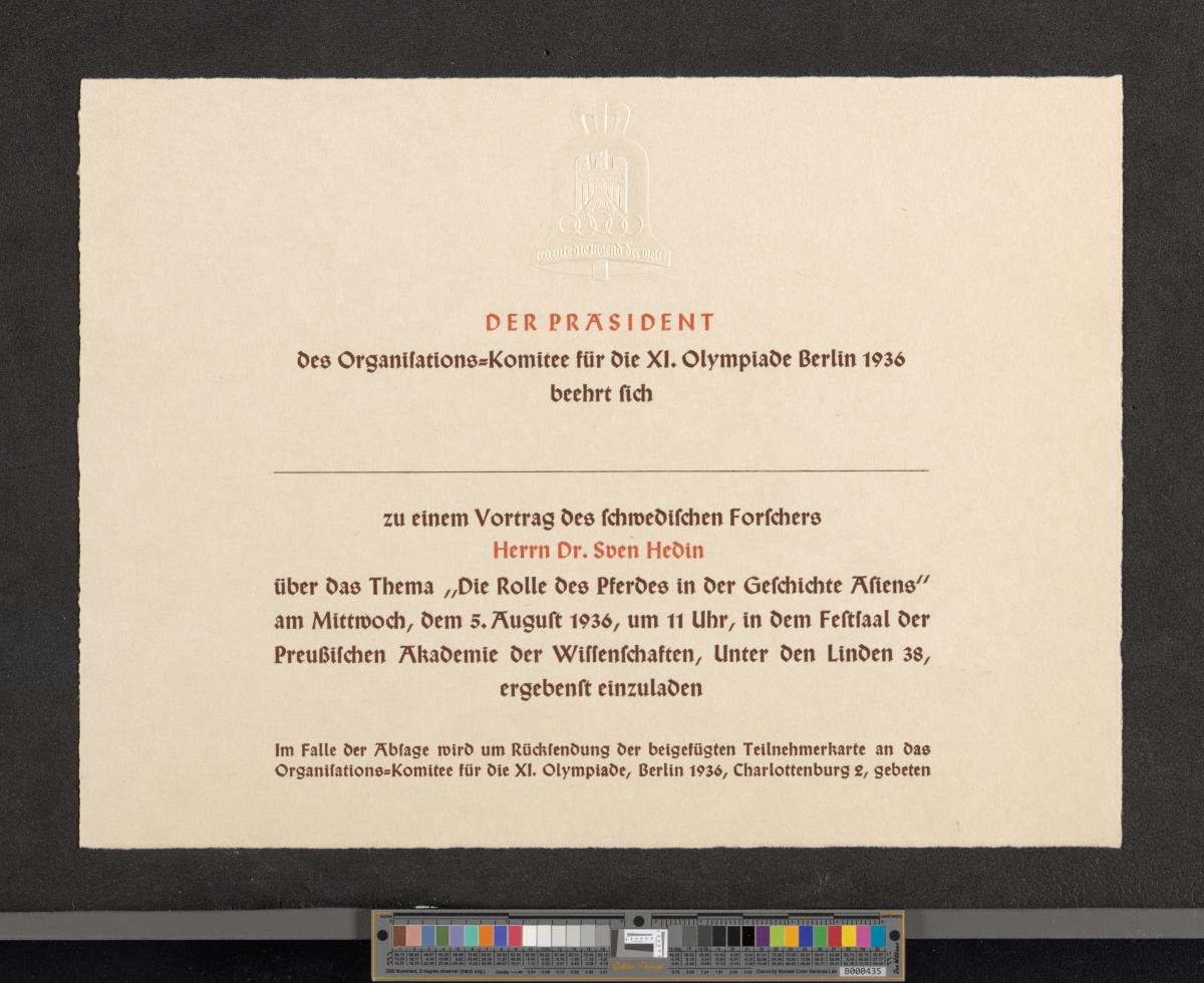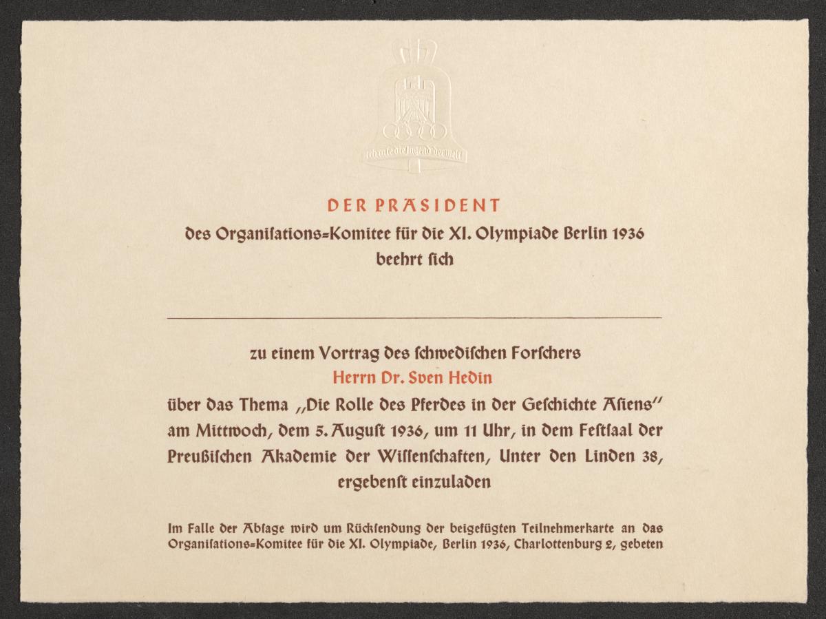 Invitation pour la conférence "Die Rolle des Pferdes in der Geschichte Asiens" par le Dr Sven Hedin, le 5 août 1936. Emblème des Jeux gaufré.