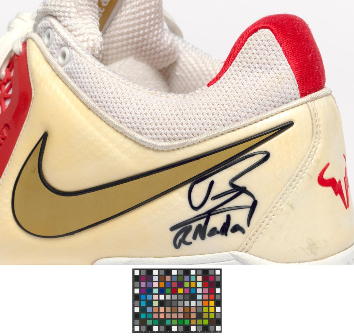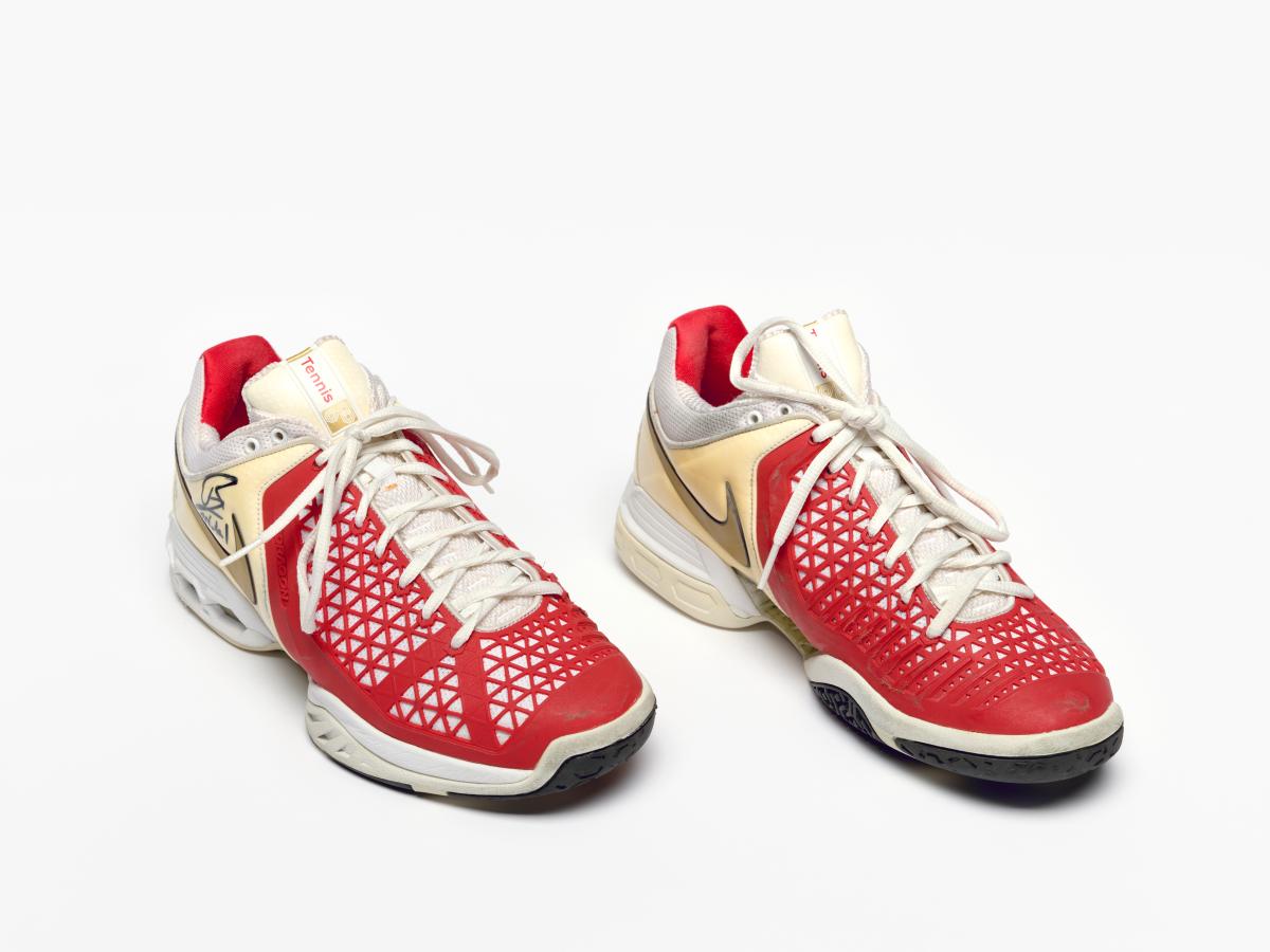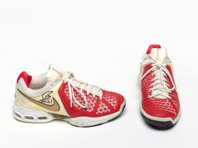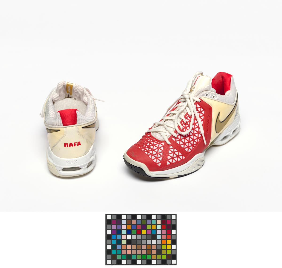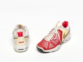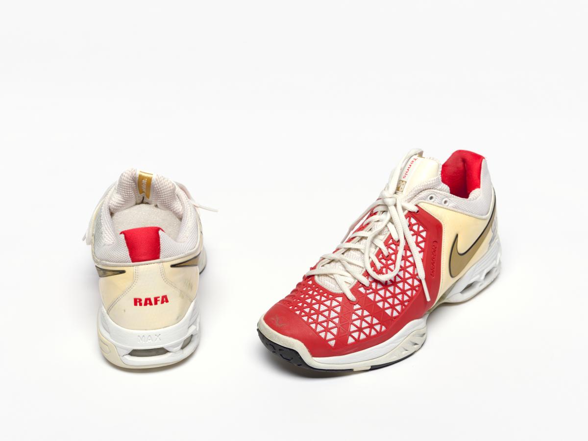 Paire de chaussures de type Air Max Breathe Cage. Modèle Dragon avec étiquette "Just Do It". Signature de l'athlète. Légende : "Rafa" au dos de la chaussure droite. Taille: 44 ou 10 (USA).