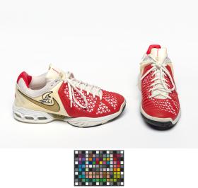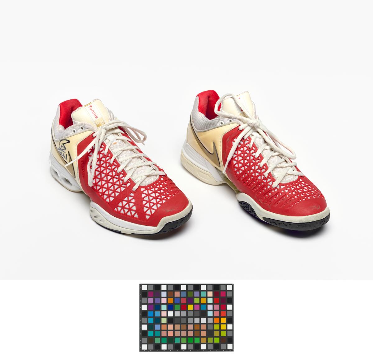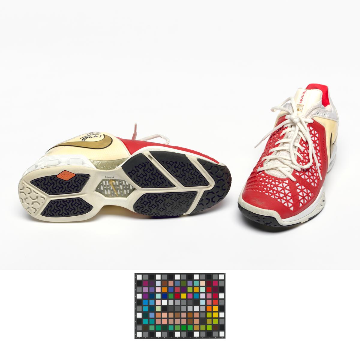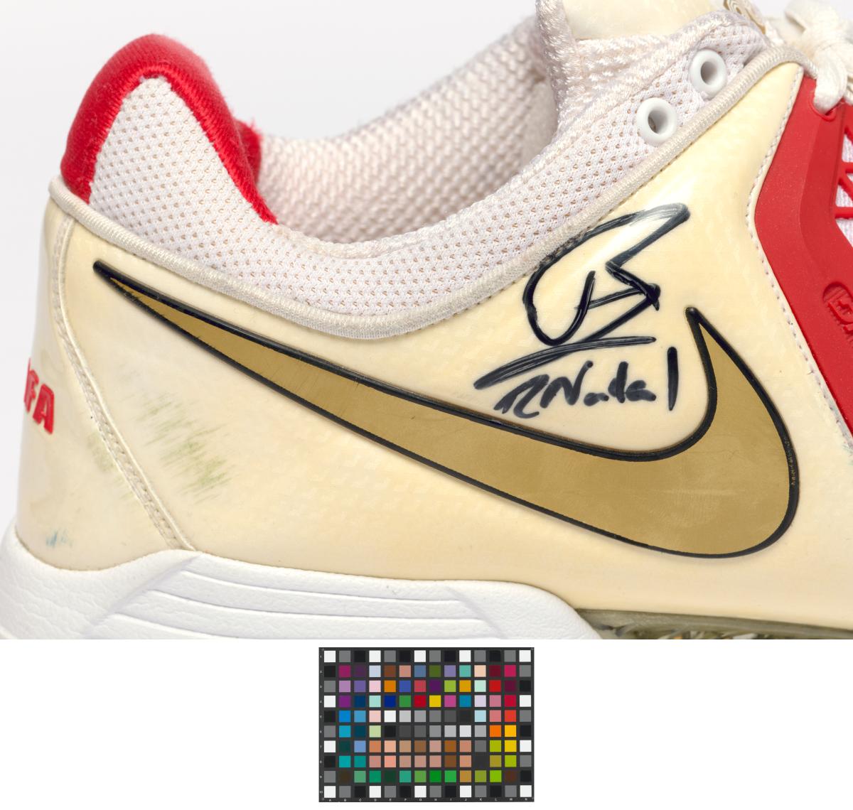 Paire de chaussures de type Air Max Breathe Cage. Modèle Dragon avec étiquette "Just Do It". Signature de l'athlète. Légende : "Rafa" au dos de la chaussure droite. Taille: 44 ou 10 (USA).
